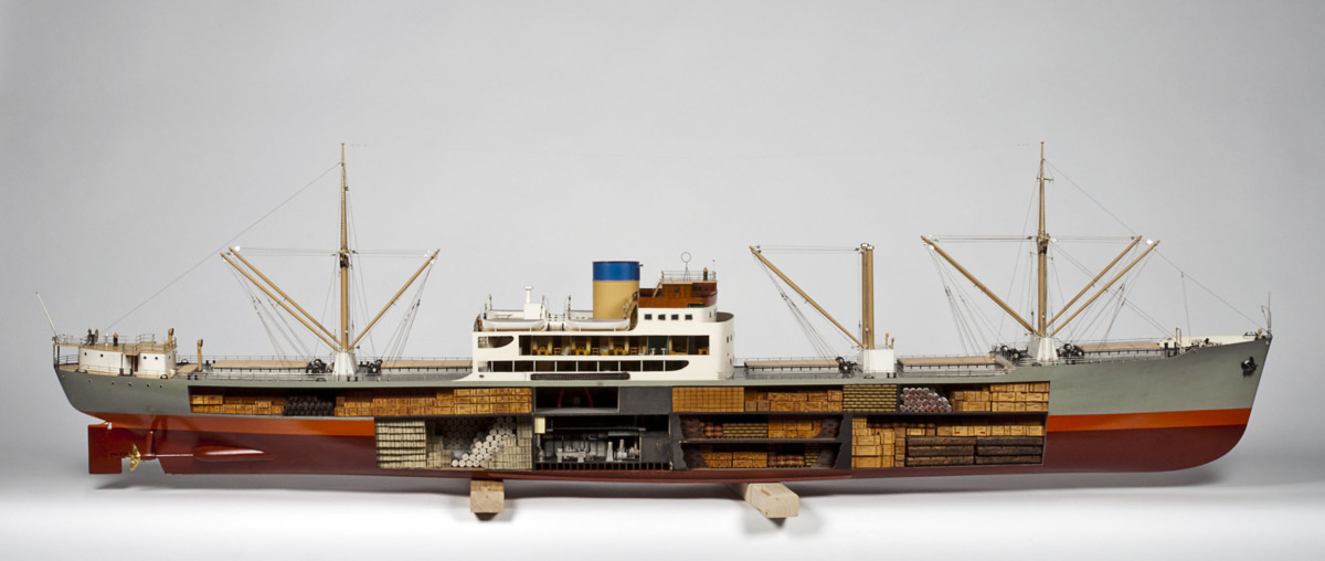Modellen visar hur ett konventionellt styckegodsfartyg ser ut i genomskärning. Maskinrum och viss inredning visas också. Lassningen av fartyg gick i princip till på samma sätt under hela 1900-talet fram till det att containern introducerades på 1960-talet. En eller flera typer av varor lyftes ombord och stuvades manuellt in i de olika lastrummen.