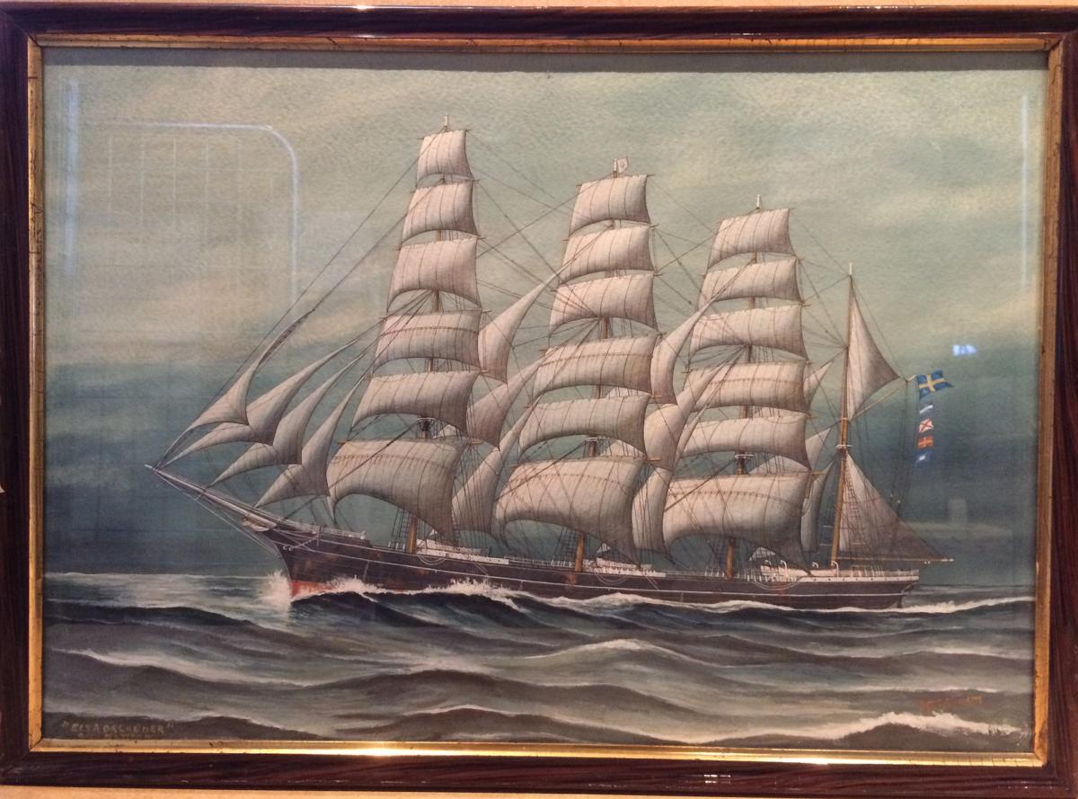 Gå tillbaka till sökLägg till i Min samlingKopiera länkSkriv utAkvarellmålningAktörerGustaf Fredriksson (1901 - 1982), KonstnärKategoriFartygsporträtt (Konst) segelfartyg (Fartygstyp)FartygELSA OLANDER, 1891, fyrmastad bark skolskeppFartygstypfyrmastad bark skolskeppMaterial och teknikpapper, akvarellDimensionerGrundmått 47,50 x 66,00 cmInventarienummerSMG34974UtställdUtställd i Hav av historierRelaterade temanHav av historier - Faror till sjöss