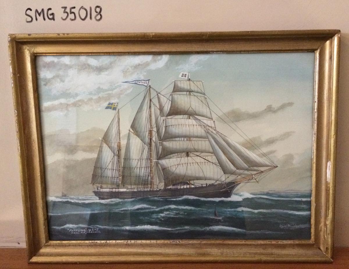Gå tillbaka till sökLägg till i Min samlingKopiera länkSkriv utAkvarellmålningFORTUNA, 1883, segelfartygAktörerGustaf Fredriksson (1901 - 1982), KonstnärKategorisegelfartyg (Fartygstyp) Fartygsporträtt (Konst)FartygFORTUNA, 1883, segelfartygMaterial och teknikpapper, akvarellDimensionerGrundmått 36,50 x 49,50 cmInventarienummerSMG35018UtställdInte utställd på museet