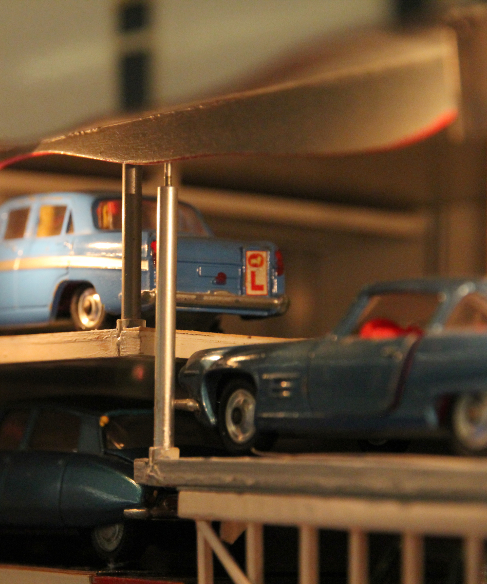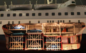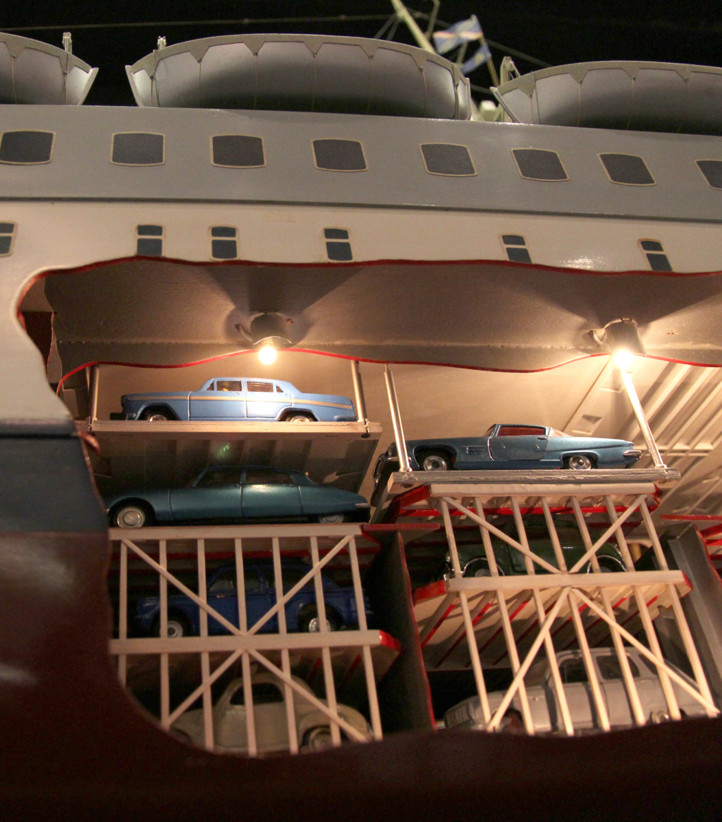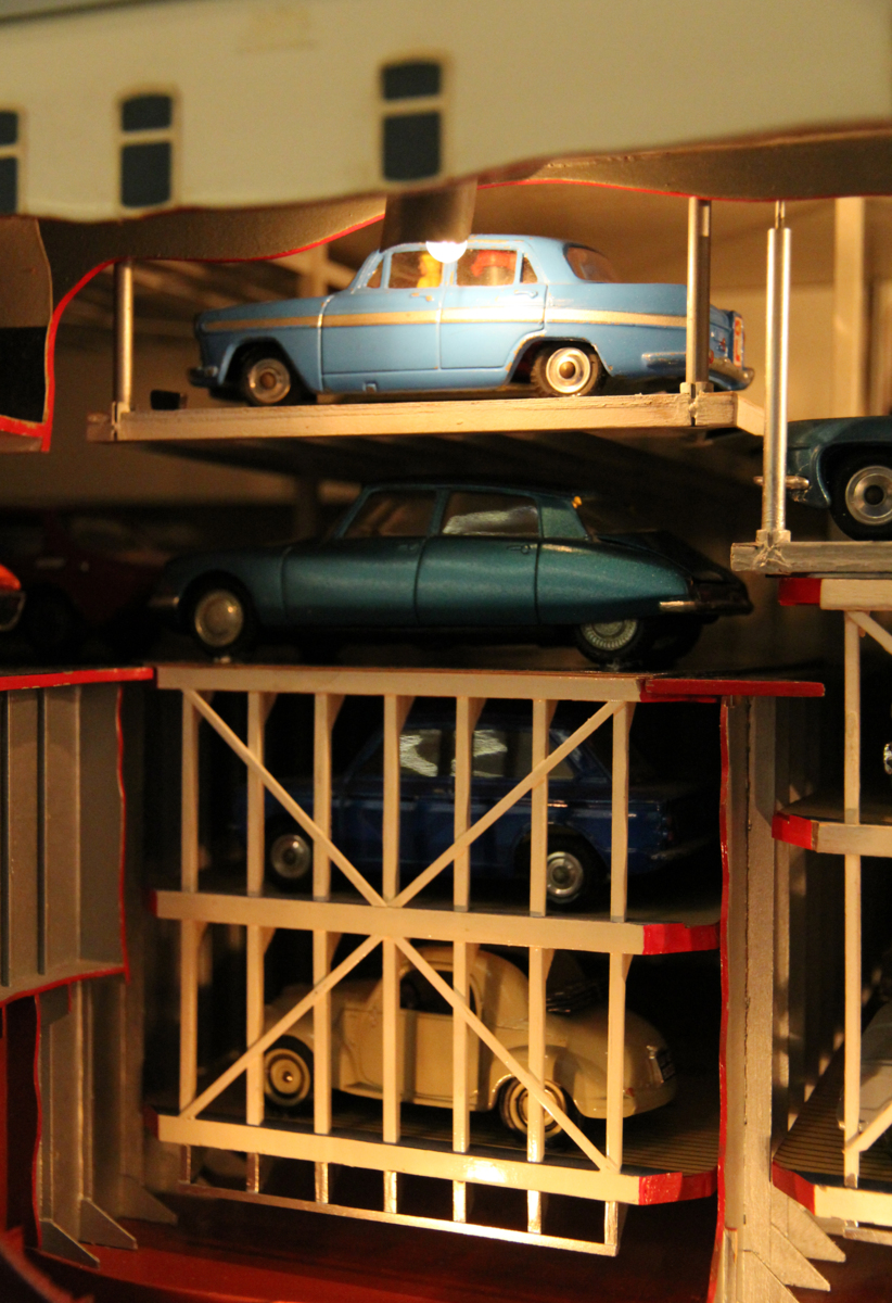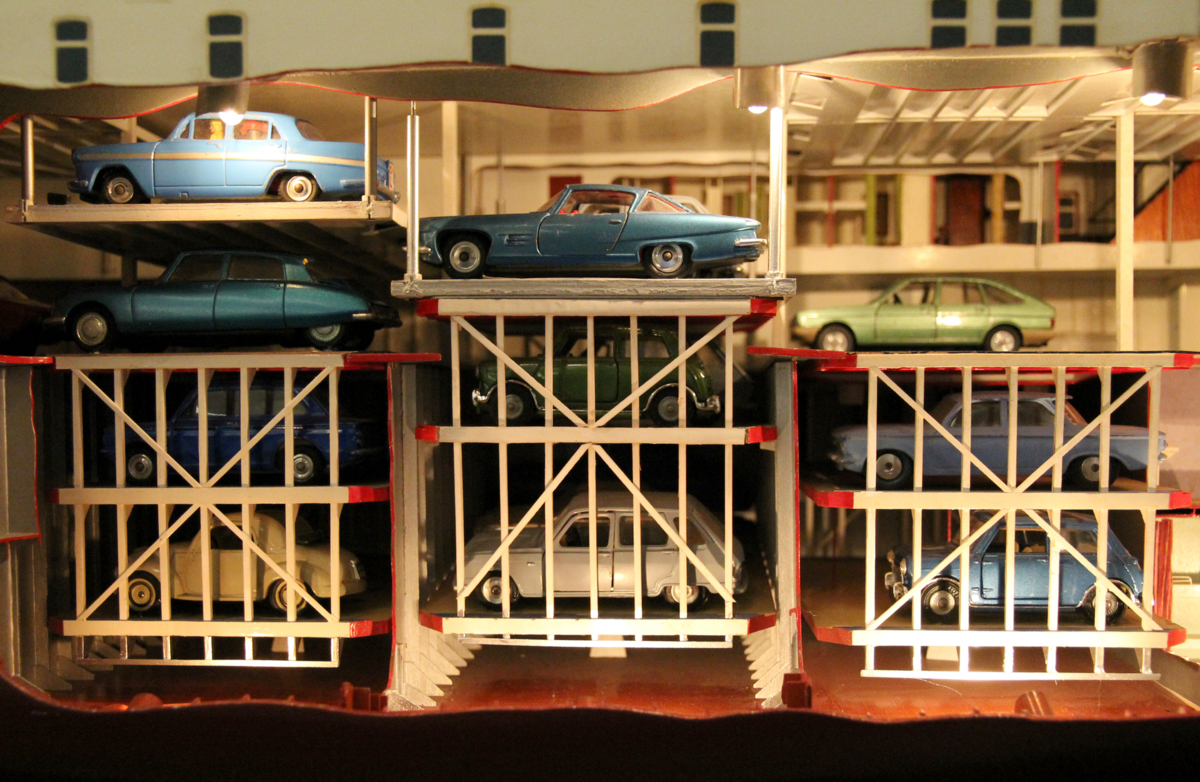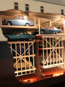 Modellen är uppskuren i sidan så man ser bilhiss arrangemang och inredning.