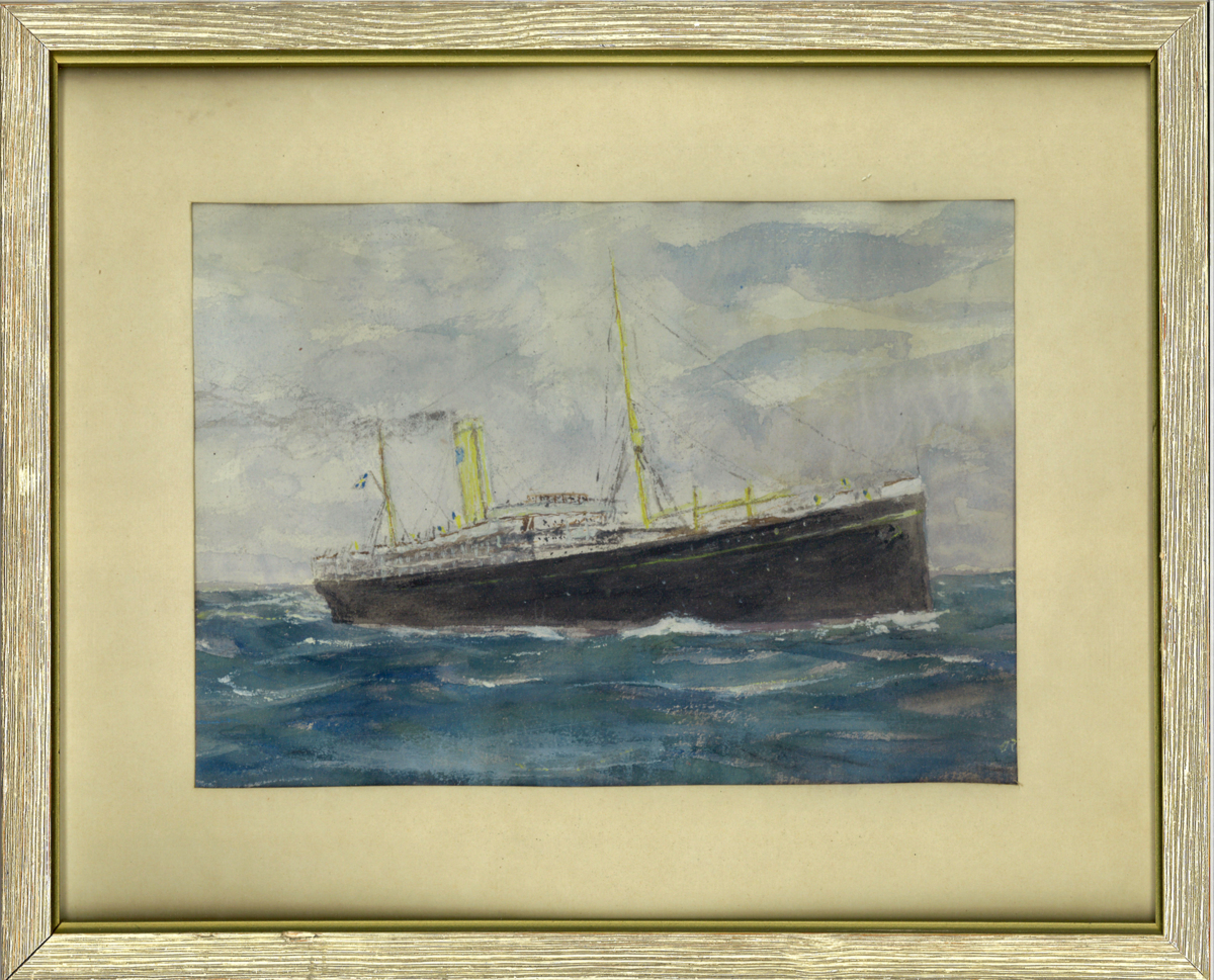 Inramad akvarellmålning föreställande ångfartyget STOCKHOLM till havs sett från styrbords sida. Skrovet är svartmålat med vitmålad överbyggnad och från den gula skorstenen med rederimärket, blå cirkel med tre gula kronor, bolmar ångröken.