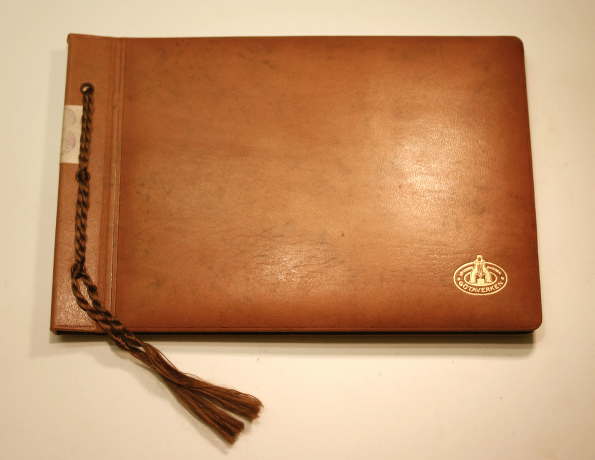 Brunt läderalbum med ombunden rygg, innehållande svartvita fotografier från från sjösättningen av m/s SAIVO och m/s KARMA den 27/9 1943.