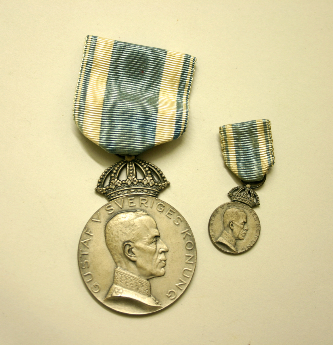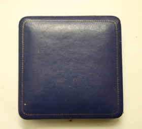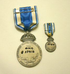 Göteborgs Kungliga Segelsällskaps förtjänstmedalj i silver med blått och gult band. Medaljerna förvarades i en blå ask av konstläder.