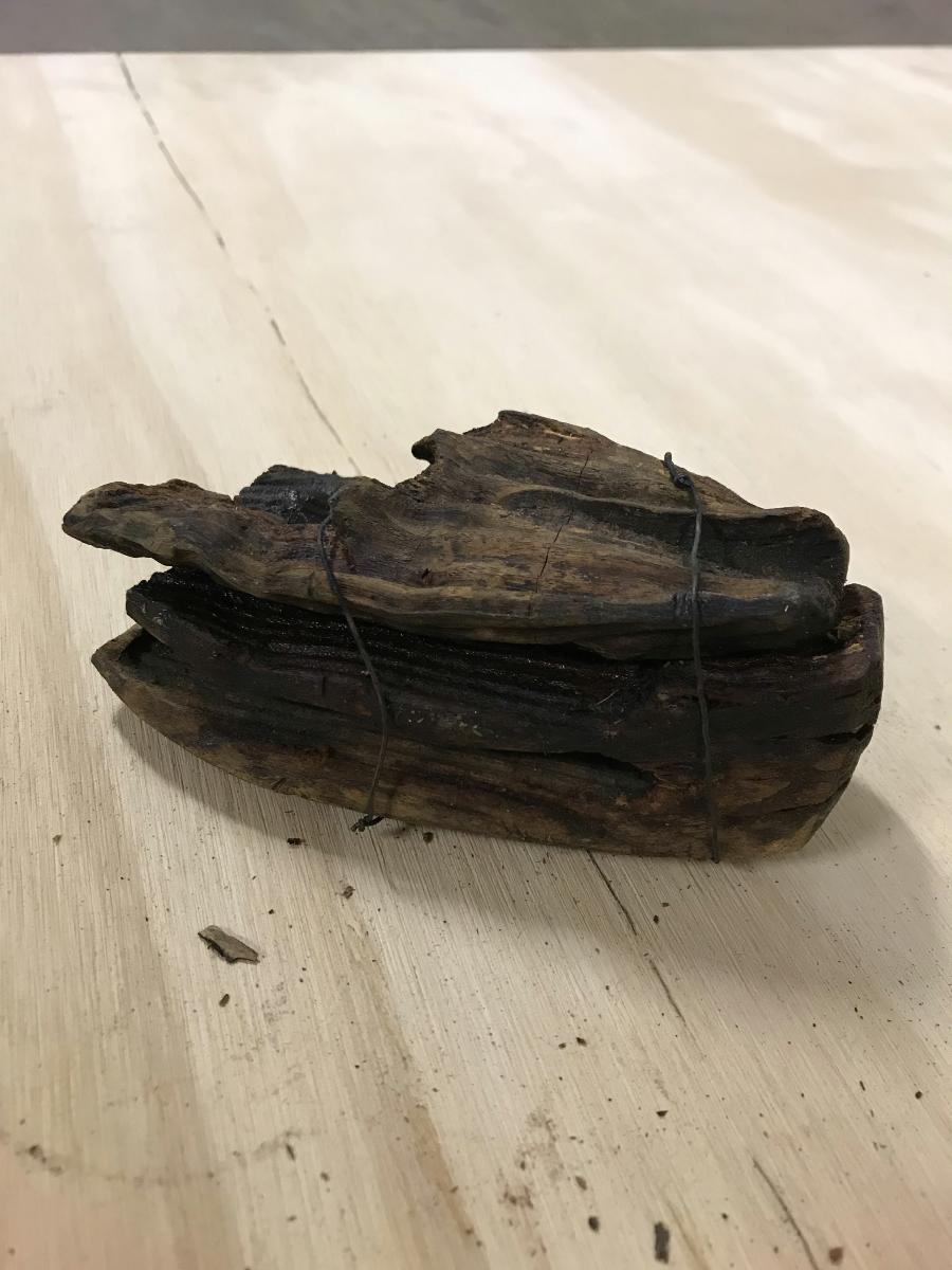 Polyglycolbehandlad. Föremålet hittades av dykare från Göteborgs amatördykarklubb som 1949-1966 genomförde dykningar vid de så kallade Slamansskeppen, i samarbete med Sjöfartsmuseet. Just detta föremål hittas 1955 eller 1958 (olika uppgifter förekommer).