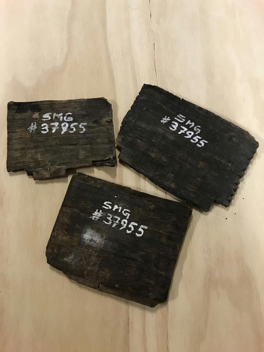 Tre träskivor som blivit polyglycolbehandlade. Hittades av dykare från Göteborgs amatördykarklubb som 1949-1966 genomförde dykningar vid de så kallade Slamansskeppen, i samarbete med Sjöfartsmuseet.