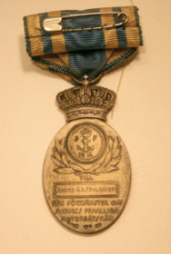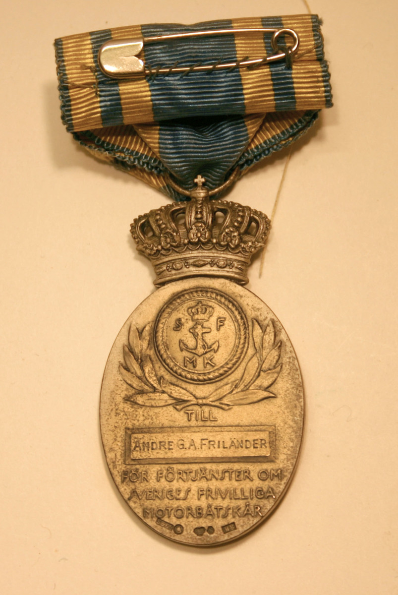 Sveriges Frivilliga Motorbåtskårs förtjänstmedalj i silver, tillverkad 1934 av Firma C. C. Sporrong AB, Stockholm. Tilldelad Andre G. A. Friländer, namnet graverat på medaljens frånsida.