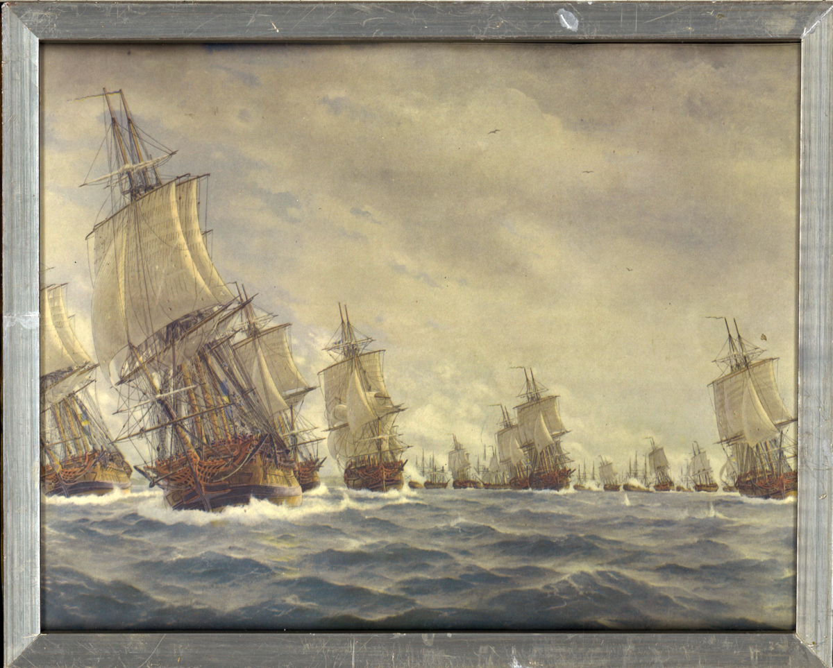 Inramat färgtryck efter oljemålning föreställande svenska flottan på Revals redd