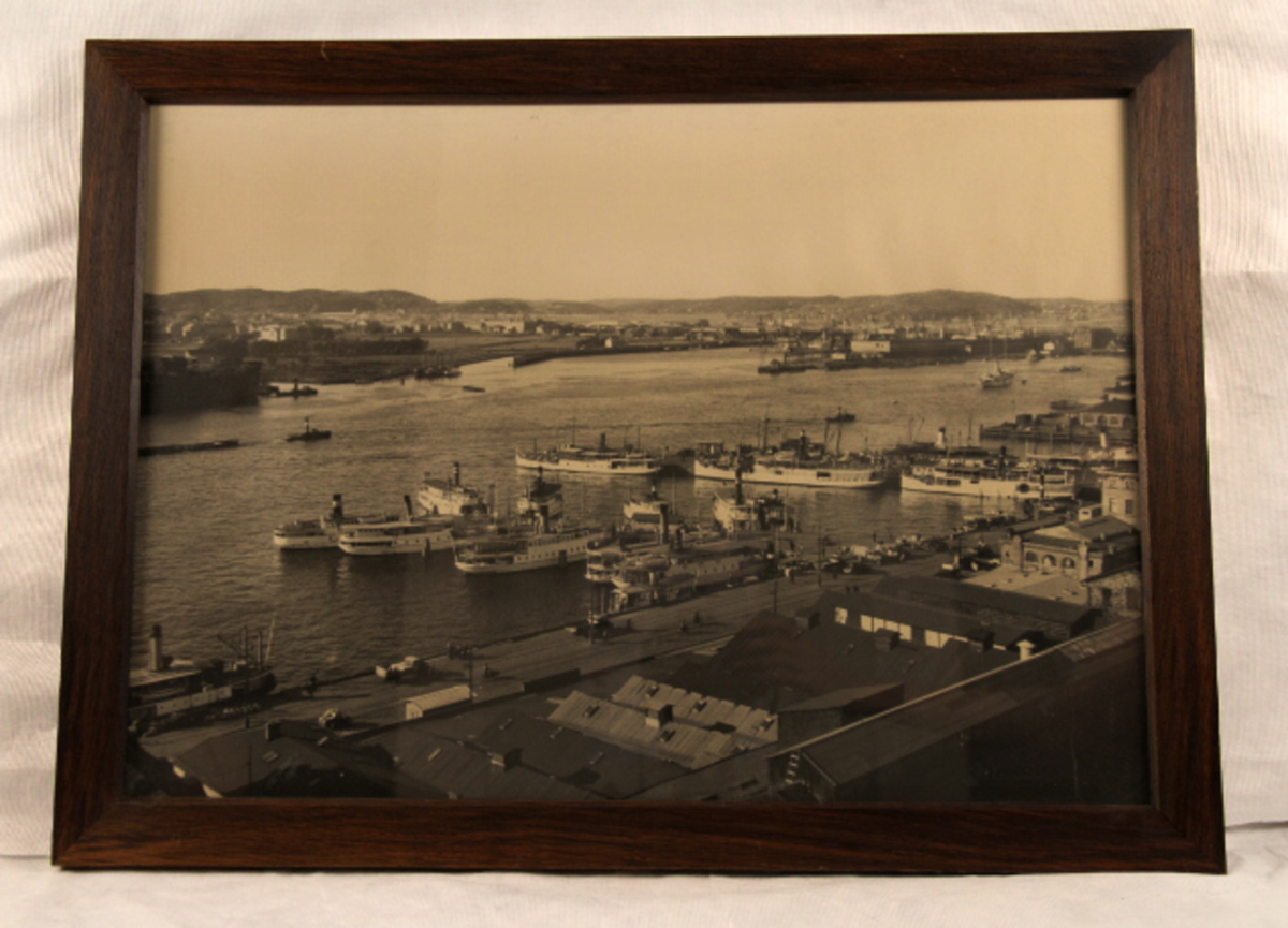 Inramad fotoförstoring föreställande en del av Göteborgs hamn, Skeppsbron. Fotografiet taget någon gång mellan 1927-1937.