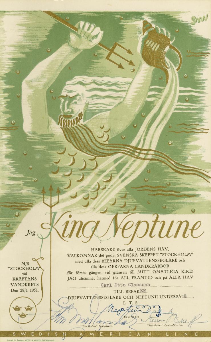 Linjedopatest utfärdat den 28/1 1951 för Carl-Otto Claesson ombord på m/s Stockholm. Atestet är förtryckt med enstaka text skriven med maskin och tre handskrivna namnteckningar för kung Neptun, befälhavaren för fartyget och kryssningsdirektören.