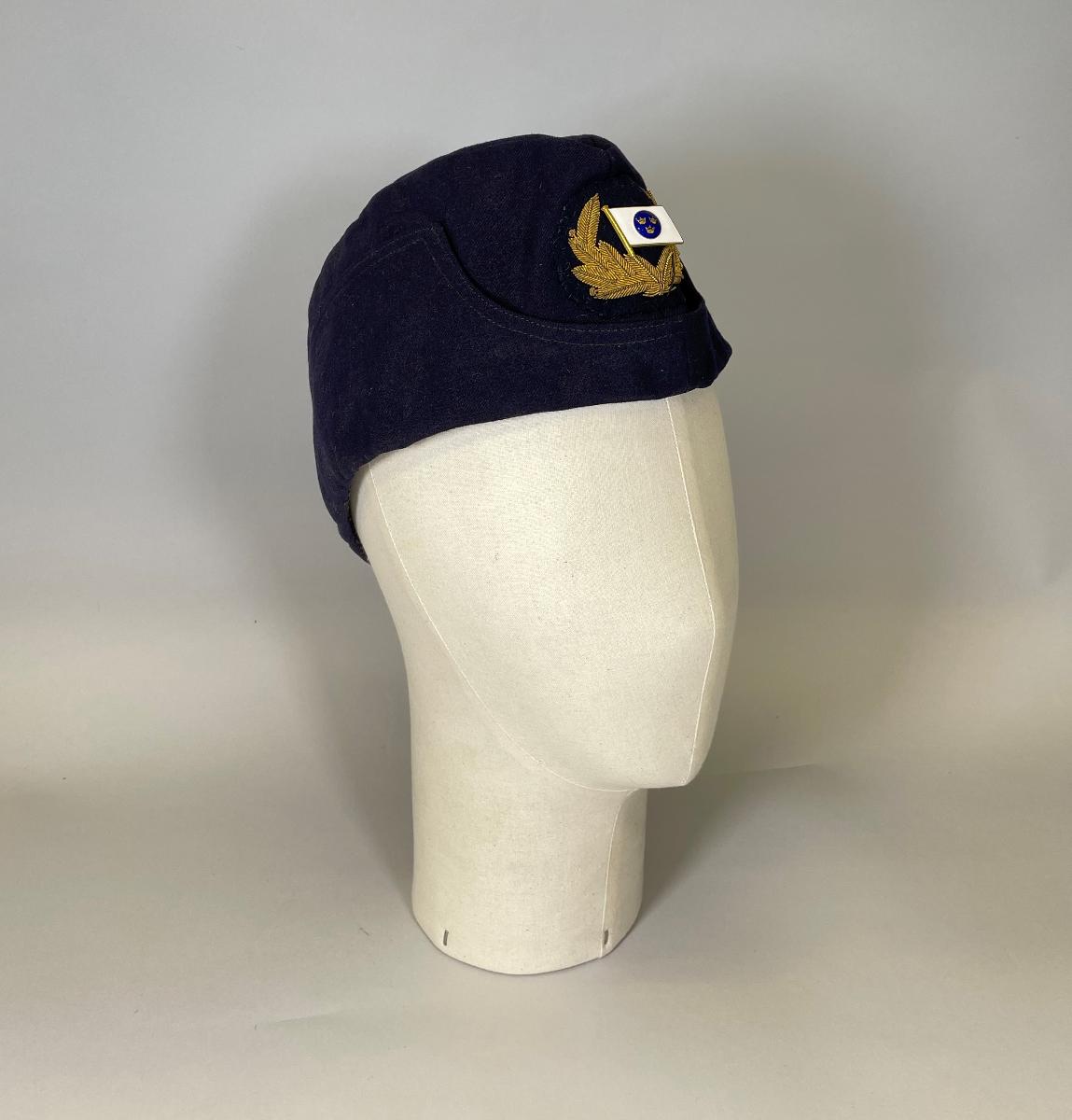 Blå båtmössa för kapten med broderar lagerkrans i guld och mössmärke i metall och emalj med tre kronor.