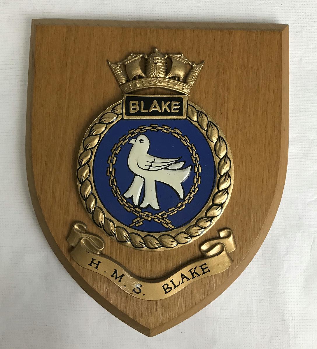 Vapensköld. Engelska lätt kryssaren HMS BLAKE monterad runt ett emblem med vit fågelpå blå botten på träplatta samt namn.