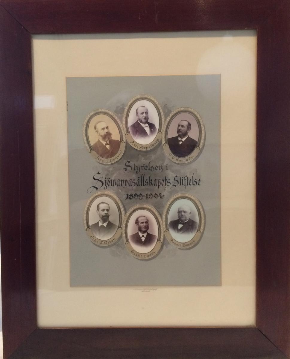 Styrelsen i Sjömannasällskapets Stiftelse 1899-1904. Visar foton av Axel Lilieqvist, Axel Appelberg, G D Kennedy, John E Olson, Gustaf Gädda, Robert Bersén.