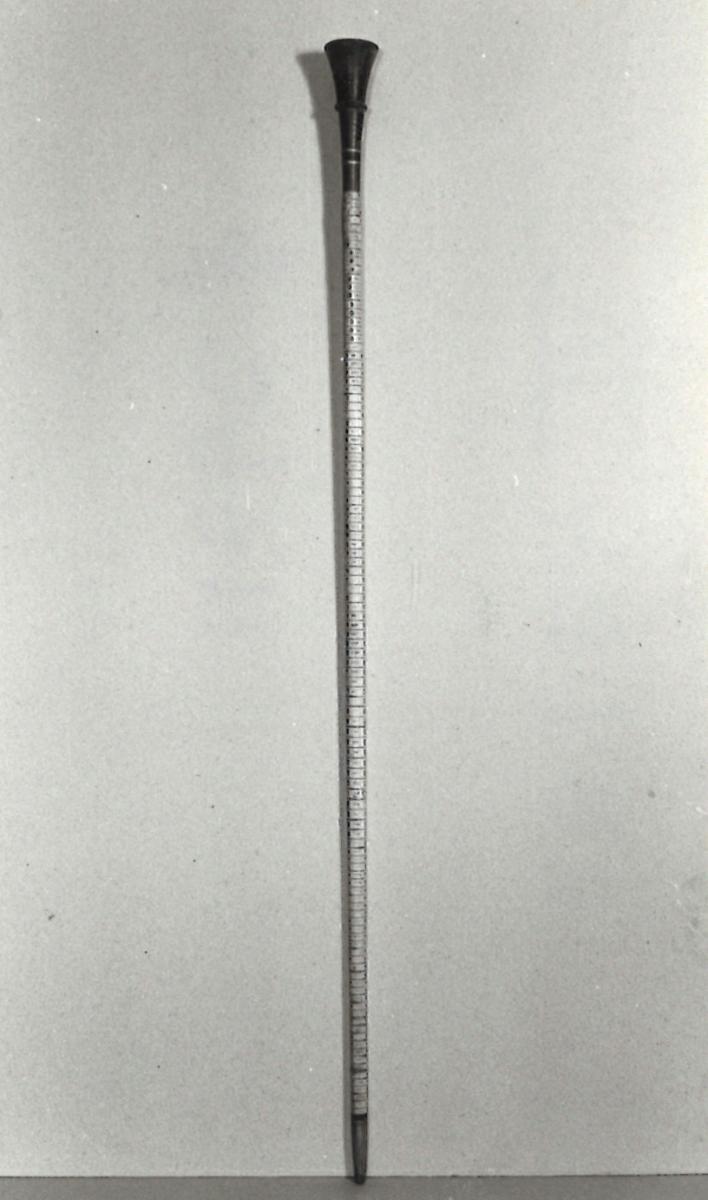 Promenadkäpp tillverkad av hajens ryggkotor som svarvats runda. Förstärkt med beslag av mässing och trä. Med etikett: H. O. Arnell