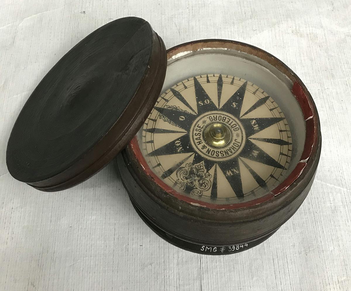 Gå tillbaka till sökLägg till i Min samlingKopiera länkSkriv utKompass i svarvad trädosaAktörerJohansson & Hasse (*1870), TillverkareKategoriluftkompass (Navigation, kursmätning, Kompass) NavigationGeografiGöteborg (Europa, Sverige, Västergötland, Västra Götalands, Göteborg)DimensionerHöjd 9,00 cm Diameter 13,50 cmInventarienummerSMG39844UtställdInte utställd på museetBeskrivningKompassen är skyddad av glasruta.