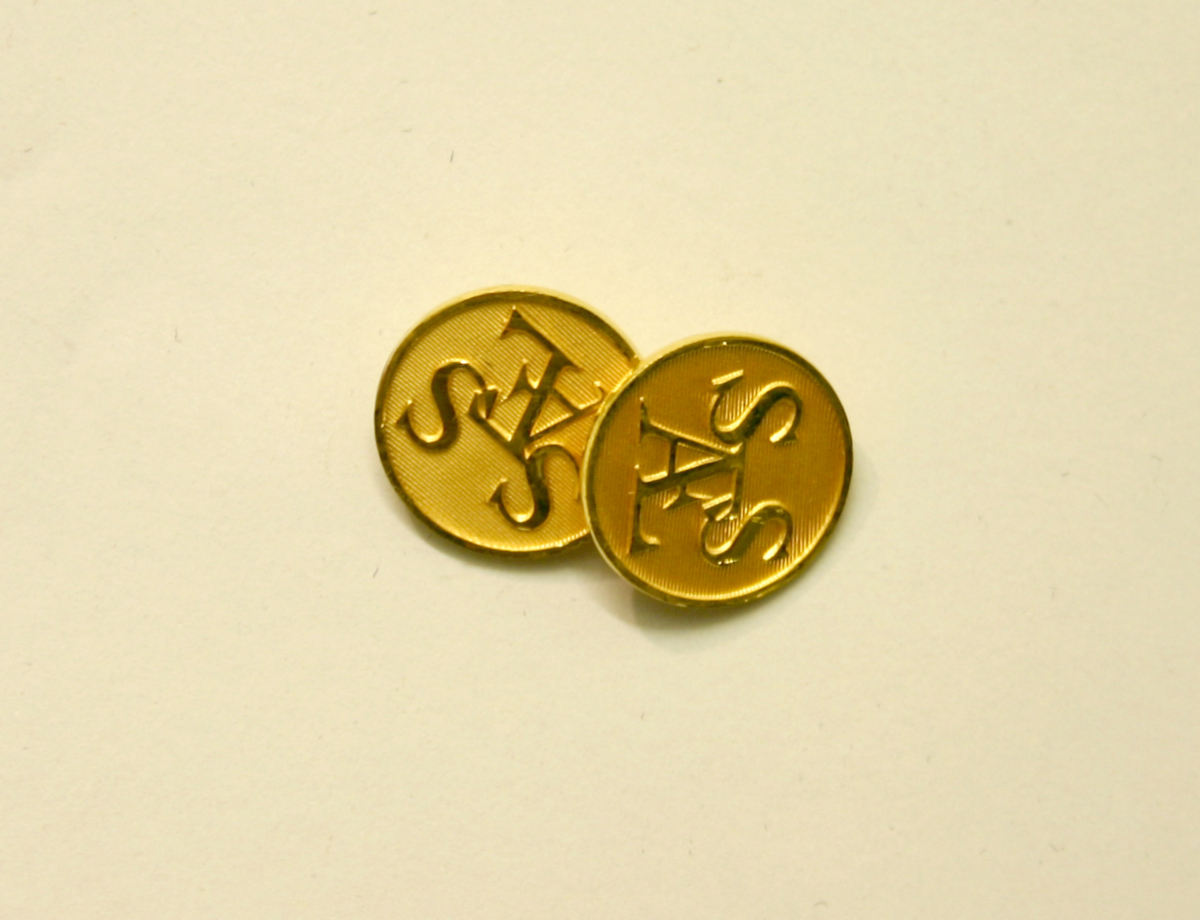Manchettknapp förgylld med ögla hopsatt med 3 st kedjeleder. Bokstäverna SSAE i logrelieff på vågrätt graverad bakgrund.