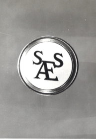 Knapp av förgylld mässing med mittfält av vit emalj och blå emalj. I mittfältet bokstäverna SSAE i blå emalj.