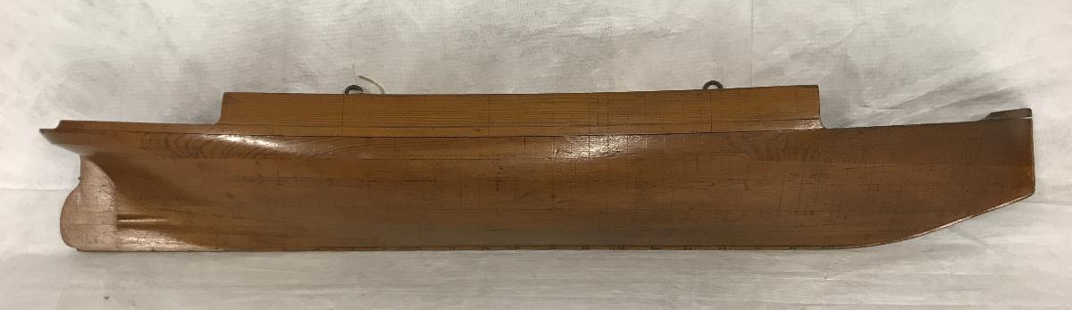 Halvmodell med plåtmarkeringar. Modellen har överbyggnad midskepps.