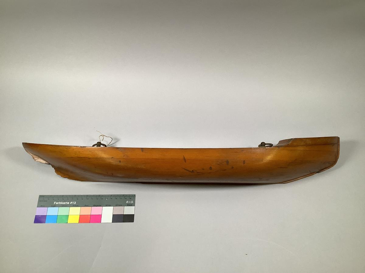 Halvmodell utan markeringar eller text. Brett skrov med isbrytarstäv. Aktre delen av köl samt roder avbrutna.