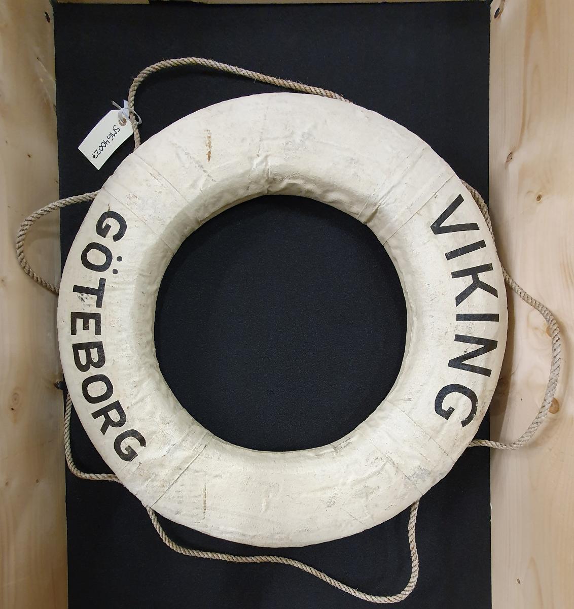 Kork med överdrag av vitmålad segelduk. Text: VIKING, GÖTEBORG.