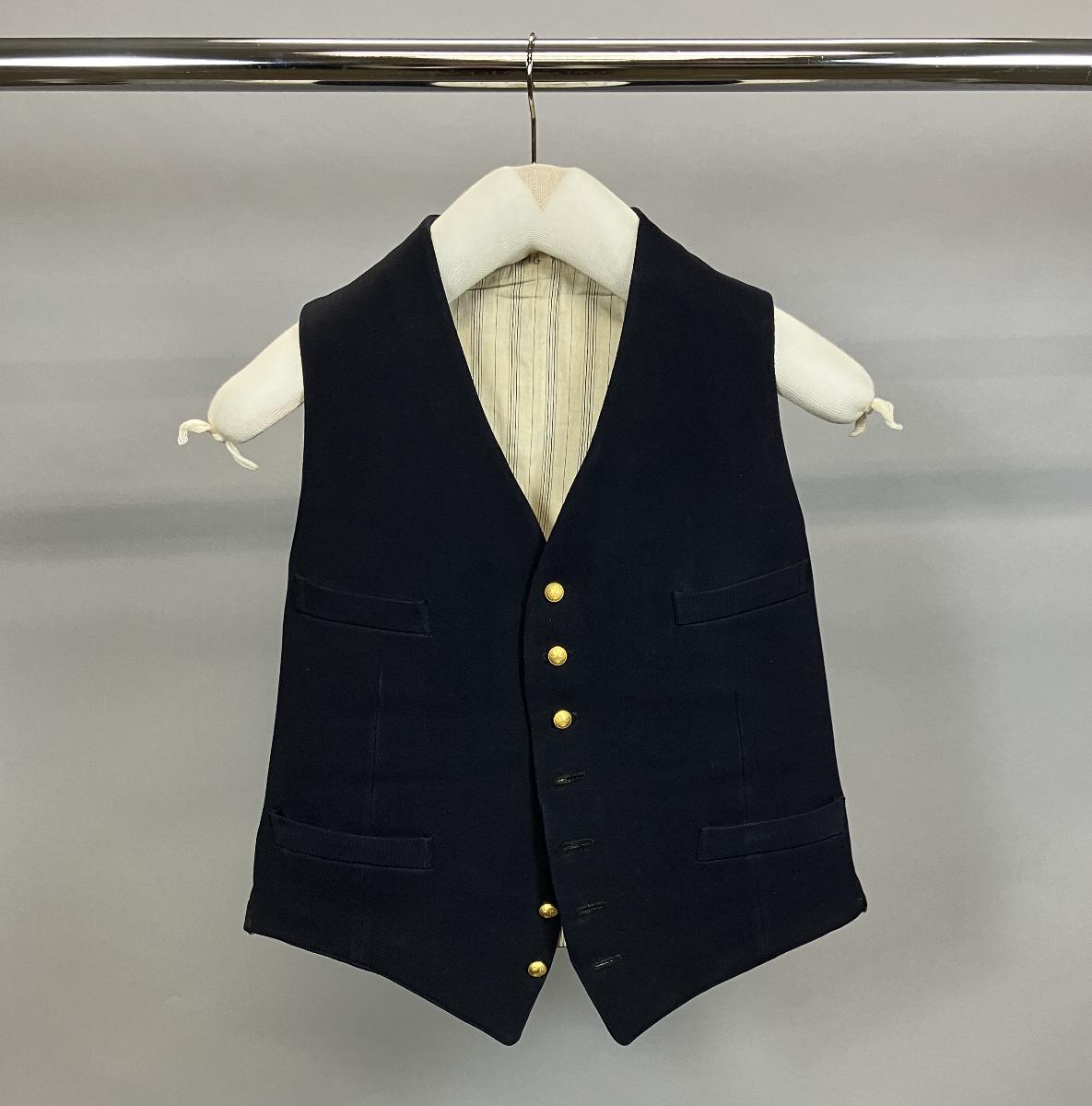 Uniformsväst av mörkblått diagonal med en rad á 7 mässingsknappar försedda med tre kronor. Randigt vitt bomullsfoder. Tillhör 40049.