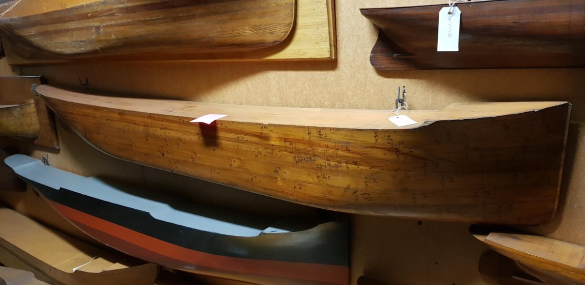 Halvmodell med spant- och plåtmarkering tillverkad på Eriksbergs Mekaniska Verkstad, Göteborg för bygge M/S 247 (M/S 0 motorfartyg, varje fartyg som byggdes på varven fick ett byggnummer till vilket man kopplade ritningar, dokumentation, beställning m.m.) och användes under produktion av fartyget.