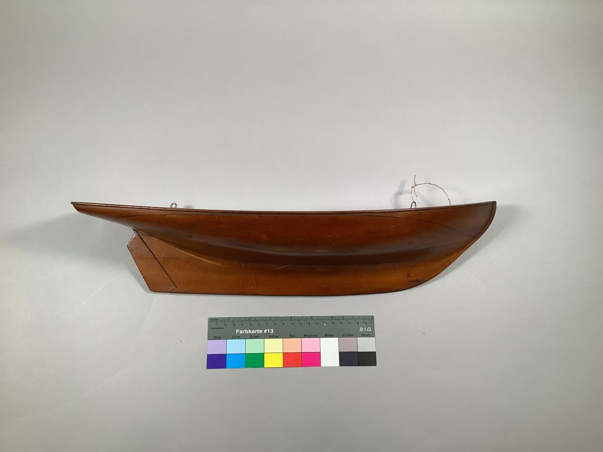 Modellen är tillverkad av fur med däck av mahogny med vatten- och krängningsvinkel inritad. Text: No 1 från GKSS vind.
