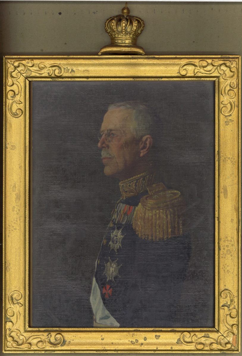 Inramat oljetryck i guldbronserad ram med stuckatur i hörnen samt kunglig krona på översidan. Har hängt i salongen på m/s KRONPRINSESSAN MARGARETA. Fartyget var det första svenska fartyget som gick genom Panamakanalen 1914-10-19.