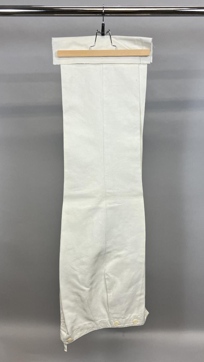 Byxor av grovt vitt linne och gulvita benknappar i gylf och midja. Tillhörande långresedräkt för officer i flottan.