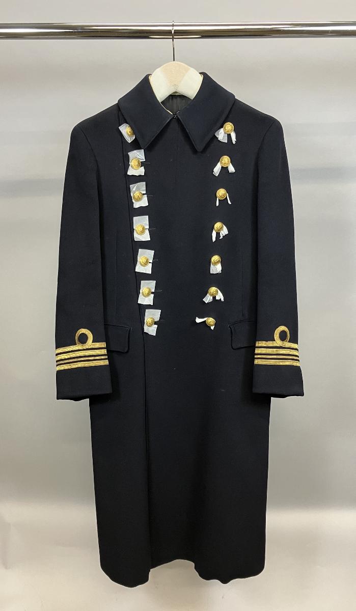 Rock m/1878 för officer i flottan. Dubbelknäppt av mörkblått tyg. Galoner för kommendörkapten av 2:a graden.