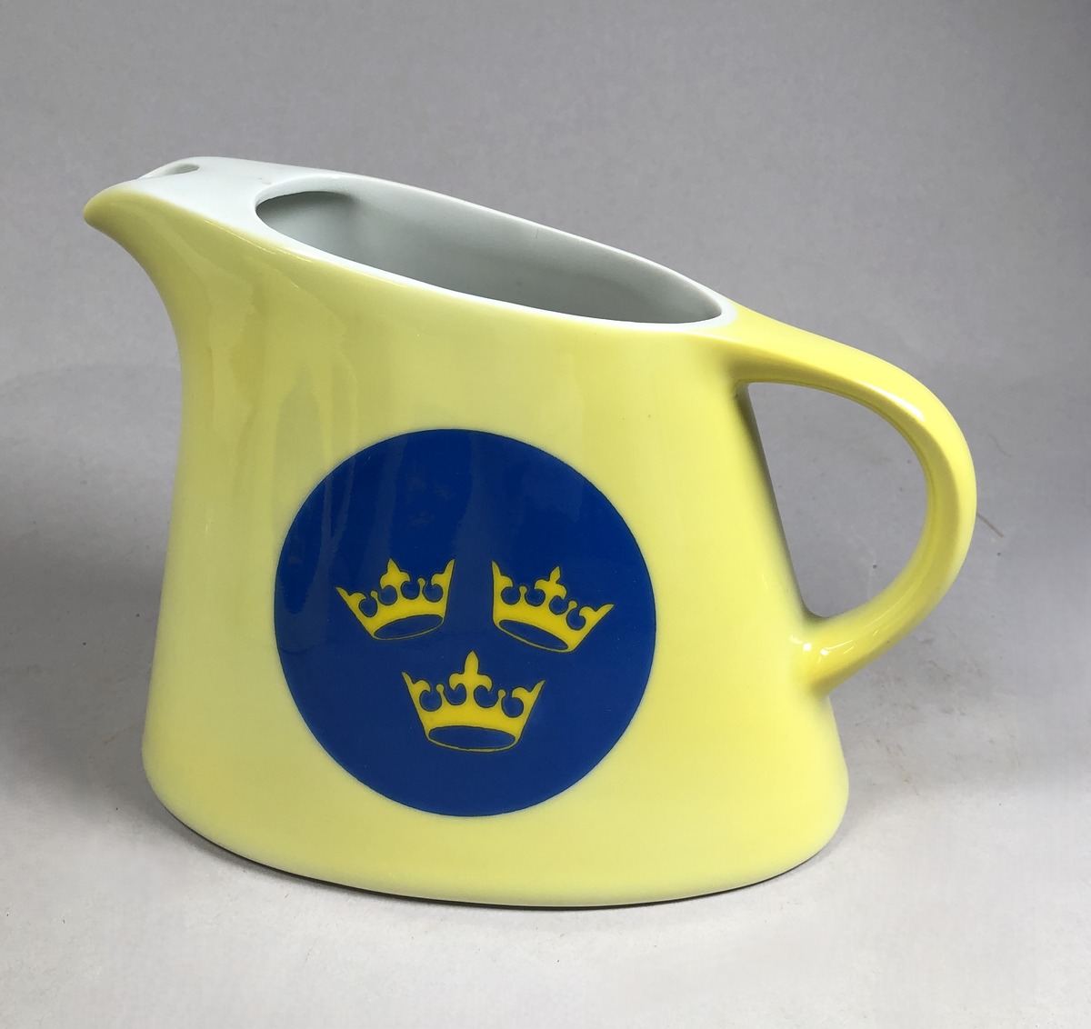 Mjölkkana av vitt porslin. Oval form med avsmalnad topp utformad som en fartygsskorsten. På utsidan försedd med gul glasyr och SAL:s emblem med tre kronor på en blå cirkel. I botten finns tillverkningsstämpel med bokstäverna K W C G inom en blå cirkel.
