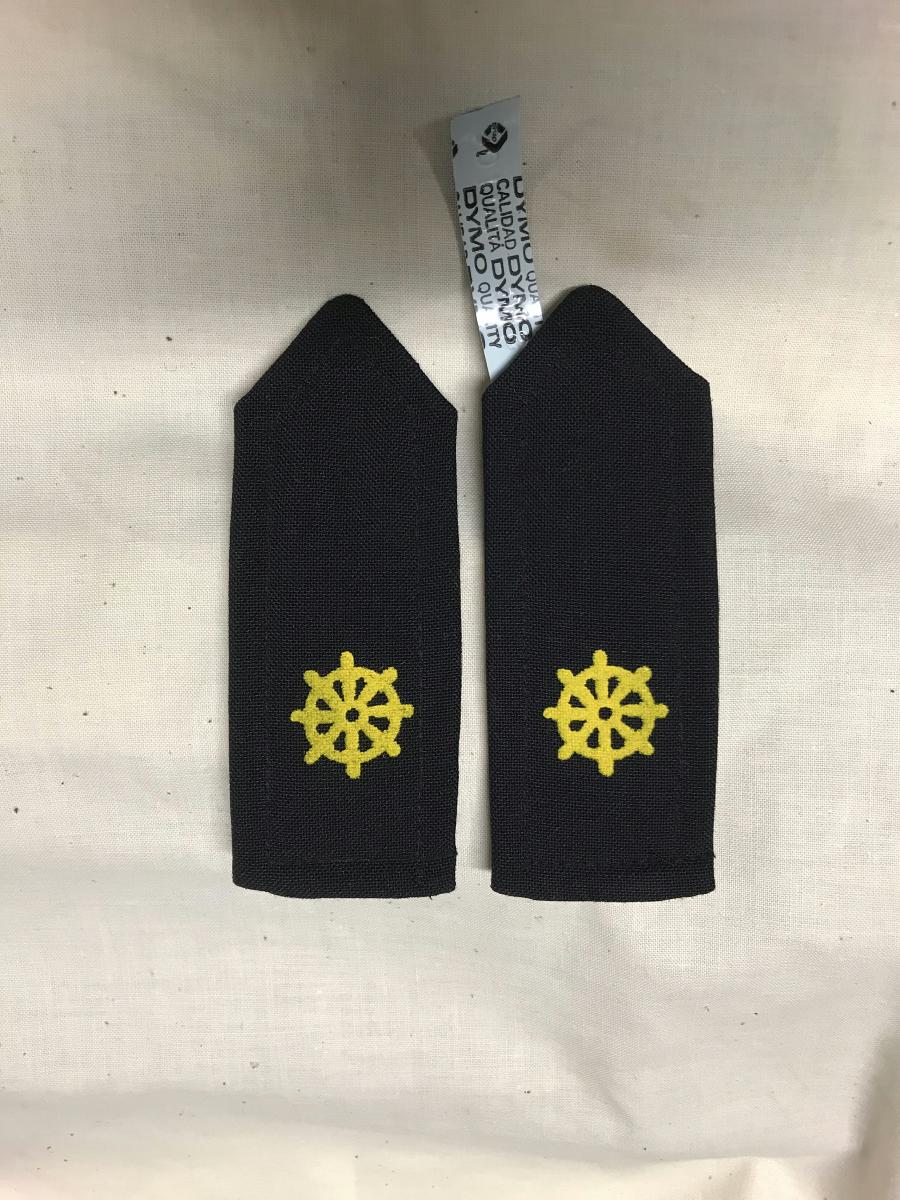 Axelkalffar av mörkblått gabardintyg med påtryckt ratt i gult. Har tillhört matrosuniform på SAL.