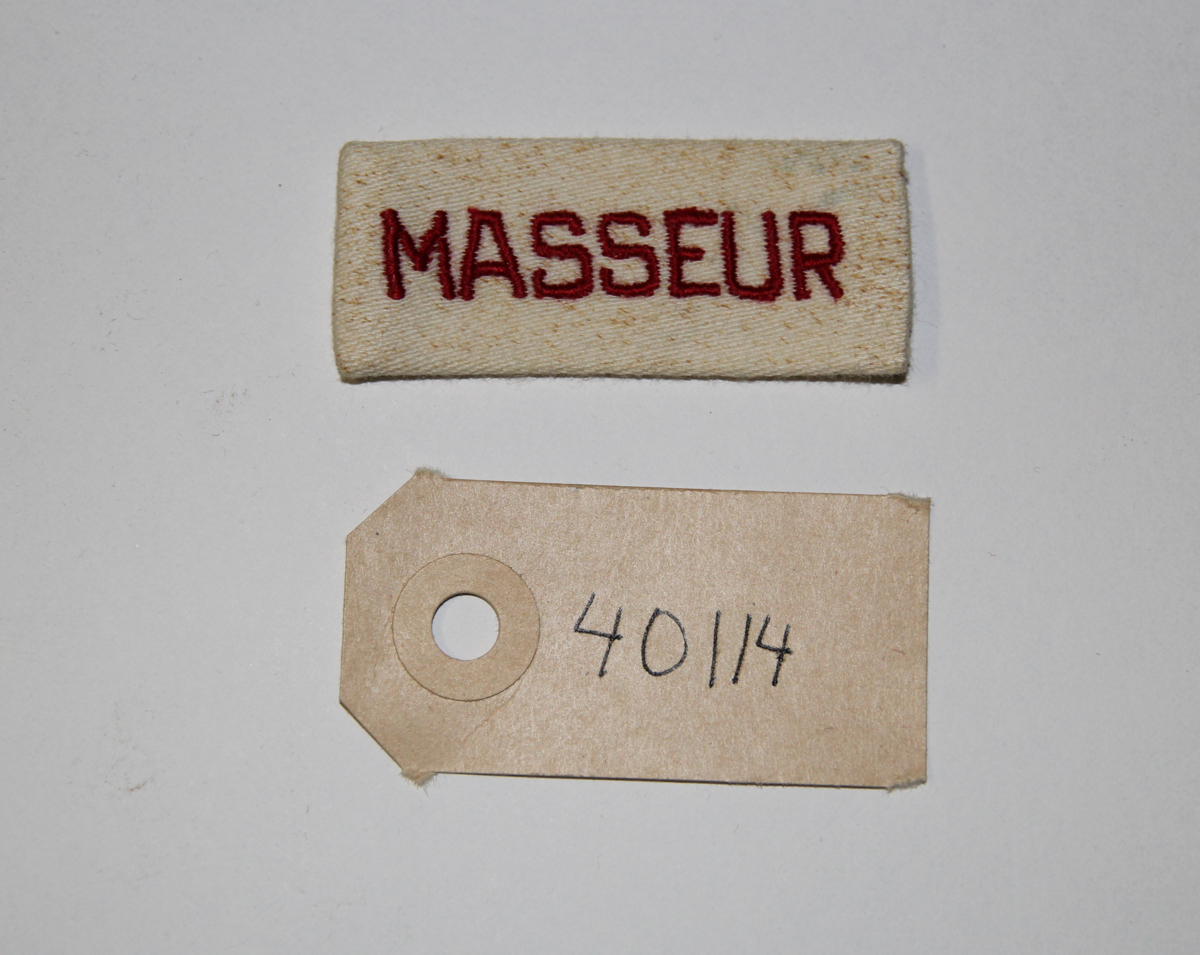 Vitt tygemblem med texten 'Masseur' i röda påsydda bokstäver. Har använts inom SAL.