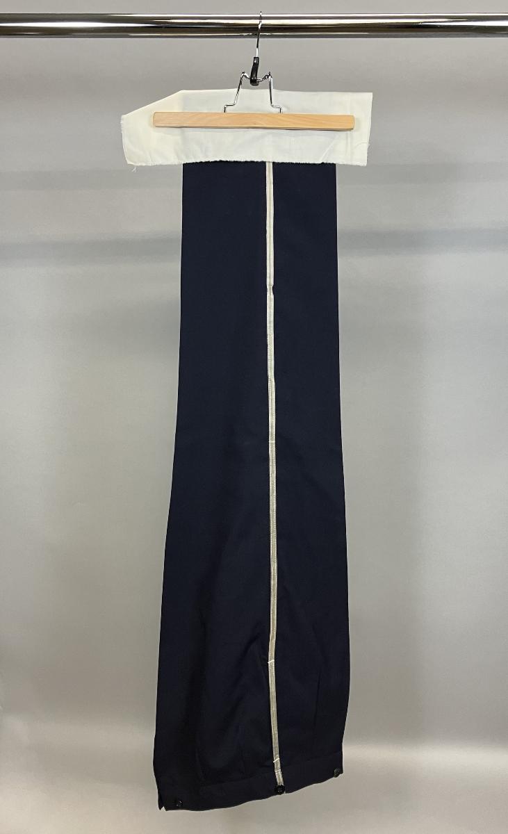 Byxor av mörkblå terylene med silvergaloner. Byxorna är oanvända och har kvar försäljningslapp i midjan med följande text: Beston best tailoring C 50 Piccolounif. Eget Ordernr 1035 löp nr 7162. Inköpt av privat firma som övertog allt SAL material efter nedläggningen av SAL's passageraretrafik våren 1976.