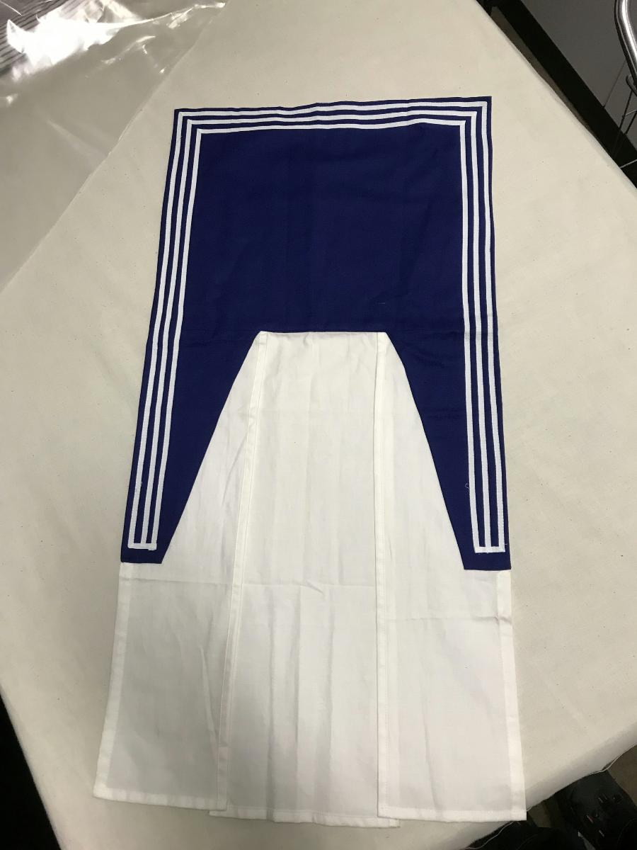 Sjömanskrage av blått bomullstyg med tre vita ränder längs kanten. Vitt linnetyg i kragsnibbar och i en rämsa häftad vid nackkanten. Kragen har tillhört Svenska Amerikaliniens sjömansbeklädning.