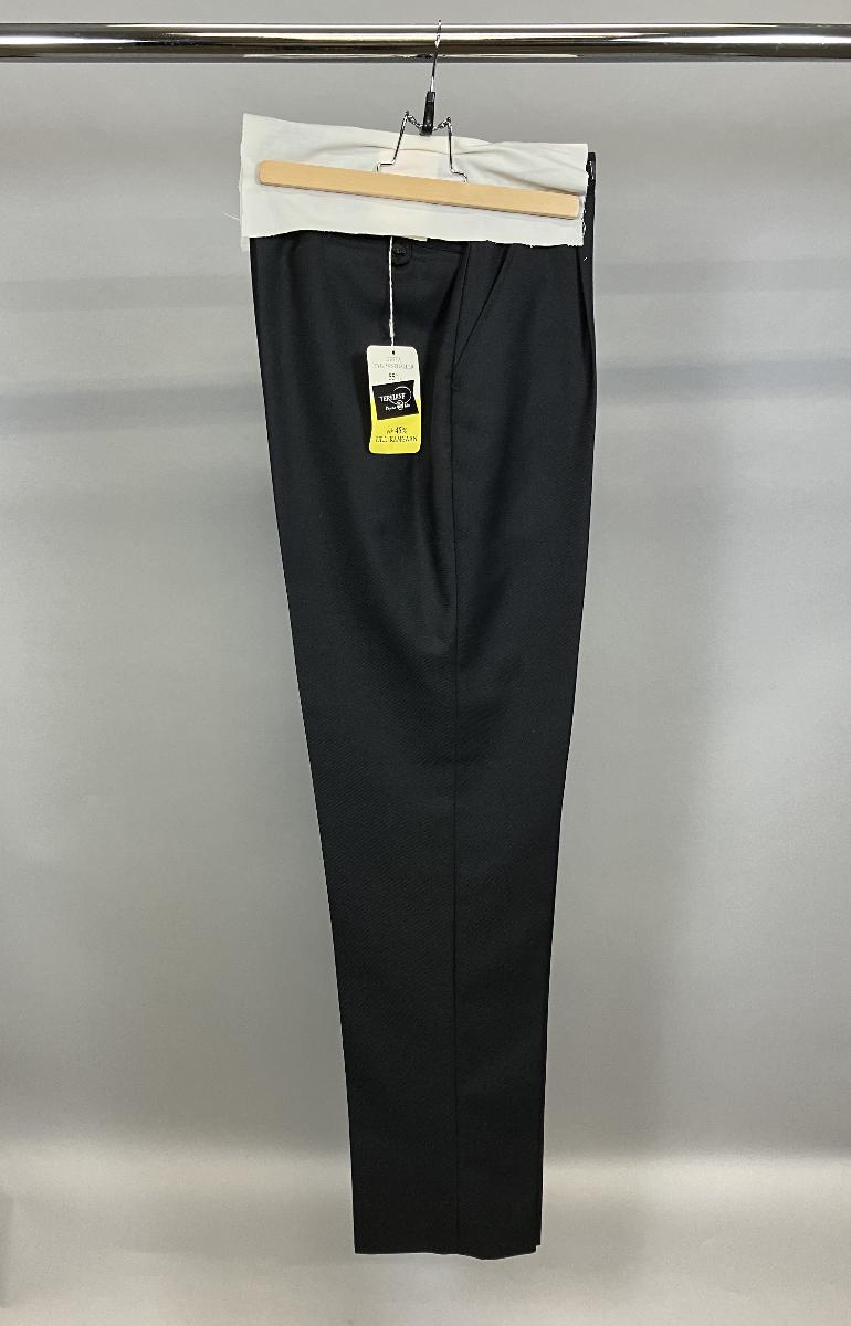 Byxor av svart ull/kamgarn. Fickor och linning av gult lintyg. Stämplat på vänstra fickans insida 146, symbolen Tre Kronor samt SAL. Trekronorstämpeln är dubblerad. En påsydd grå tygskylt i linningens vänstra sida har texten: 55 % Terylene Polyester ICI fiber and 45% wool worsted. En pappersskylt sitter i högra sidans linning med texten. En kvalitetsbyxa med passform. Kvalité 18994, mod. 6345. Färg svart, Storl. B 146. Vidhängande kartong i gult och vitt med tvättanvisning. Fabriksny