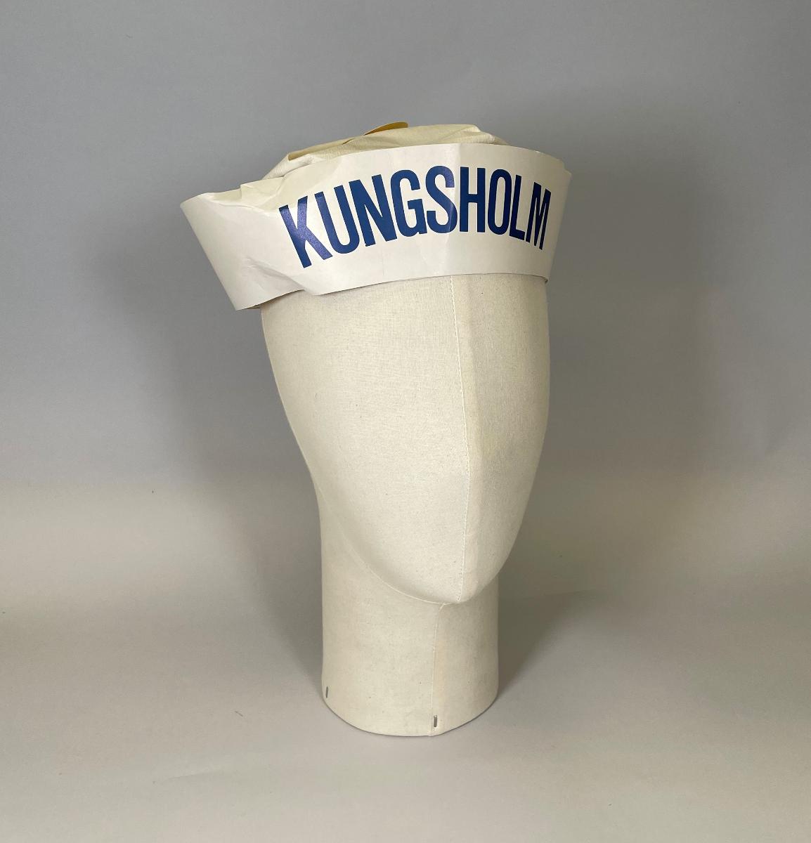 Sjömansmössa av vitt papper och kartong med texten 'Kungsholm' i blått. Har använts vid maskerader ombord i SAL's M/S Kungsholm.