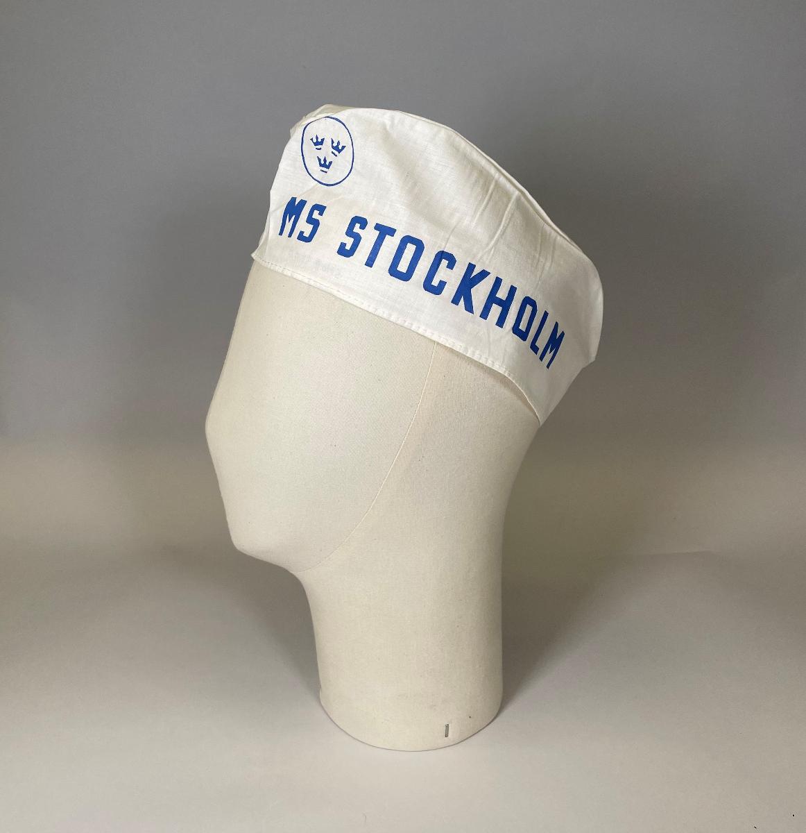 Båtmösa av vitt linne med texten MS STOCKHOLM på ena sidan och Childrens´party på den andra.