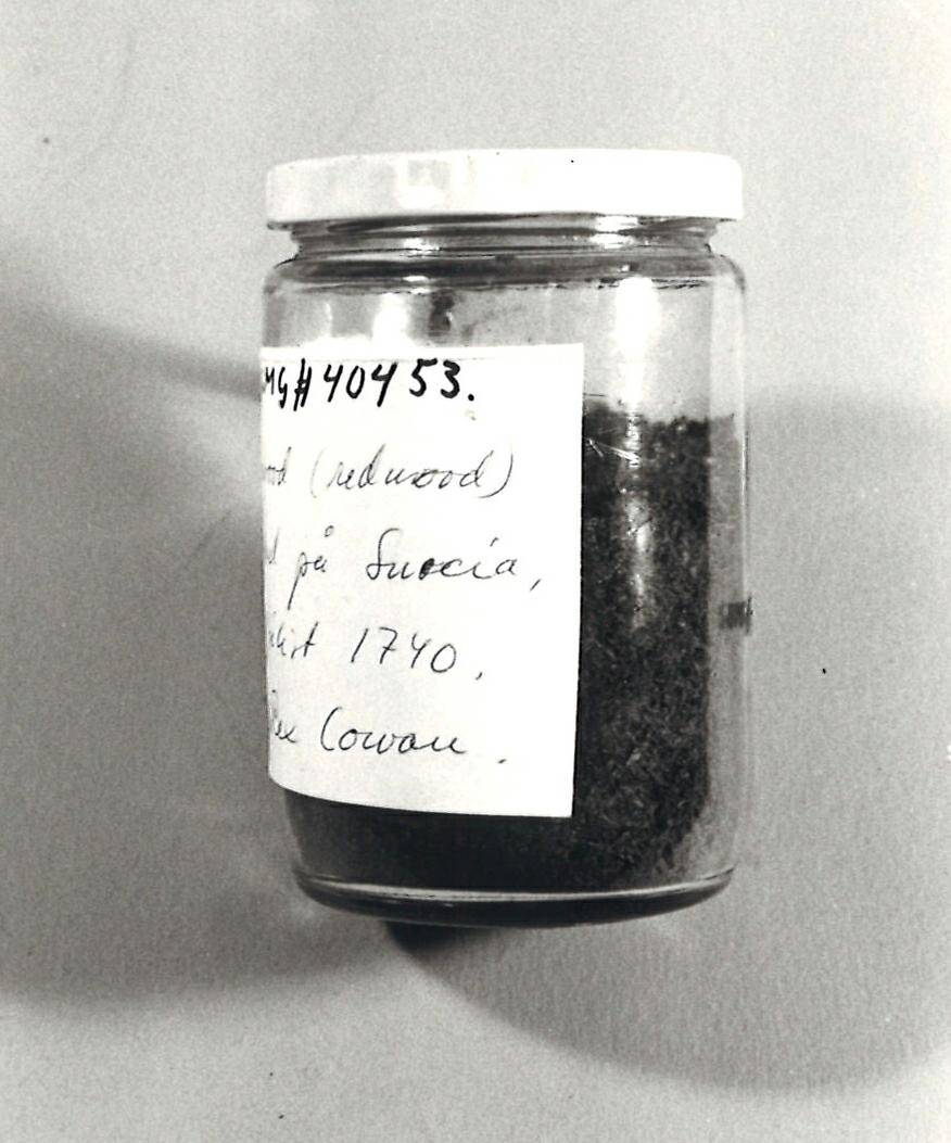 Träspån från ostindiefararen SUECIA. På burken en fastklistrad lapp med texten "Sågspån av dyewood (redwood) från lasten ombord på Suecia..."