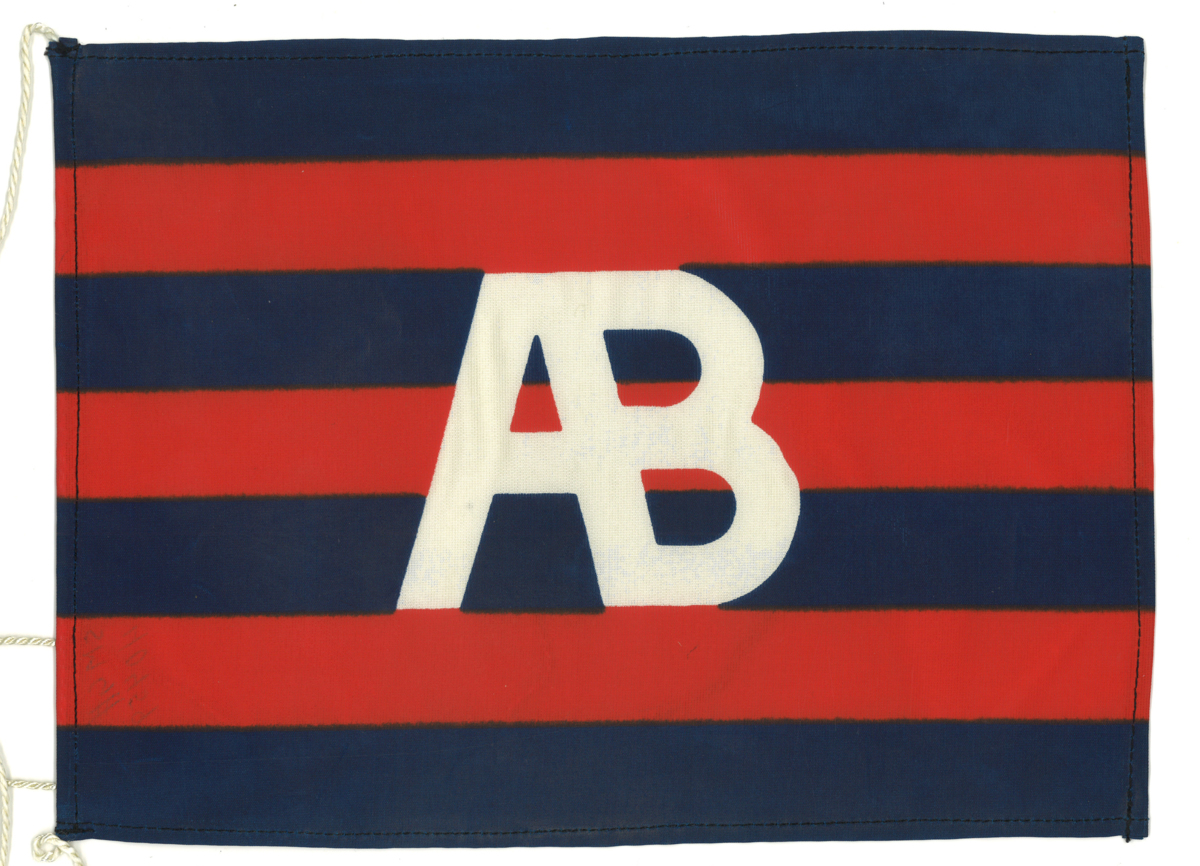 Flagga med röda och mörkblå horisontella band, tre röda och fyra blå. Bokstäverna AB i vitt på mitten av flaggan.