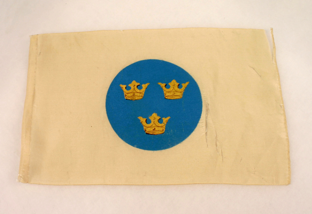 Vit fållad konstfiberduk med ett circelformat blått färgat fält. På fältet tre guldfärgade kronor med röda detaljer.