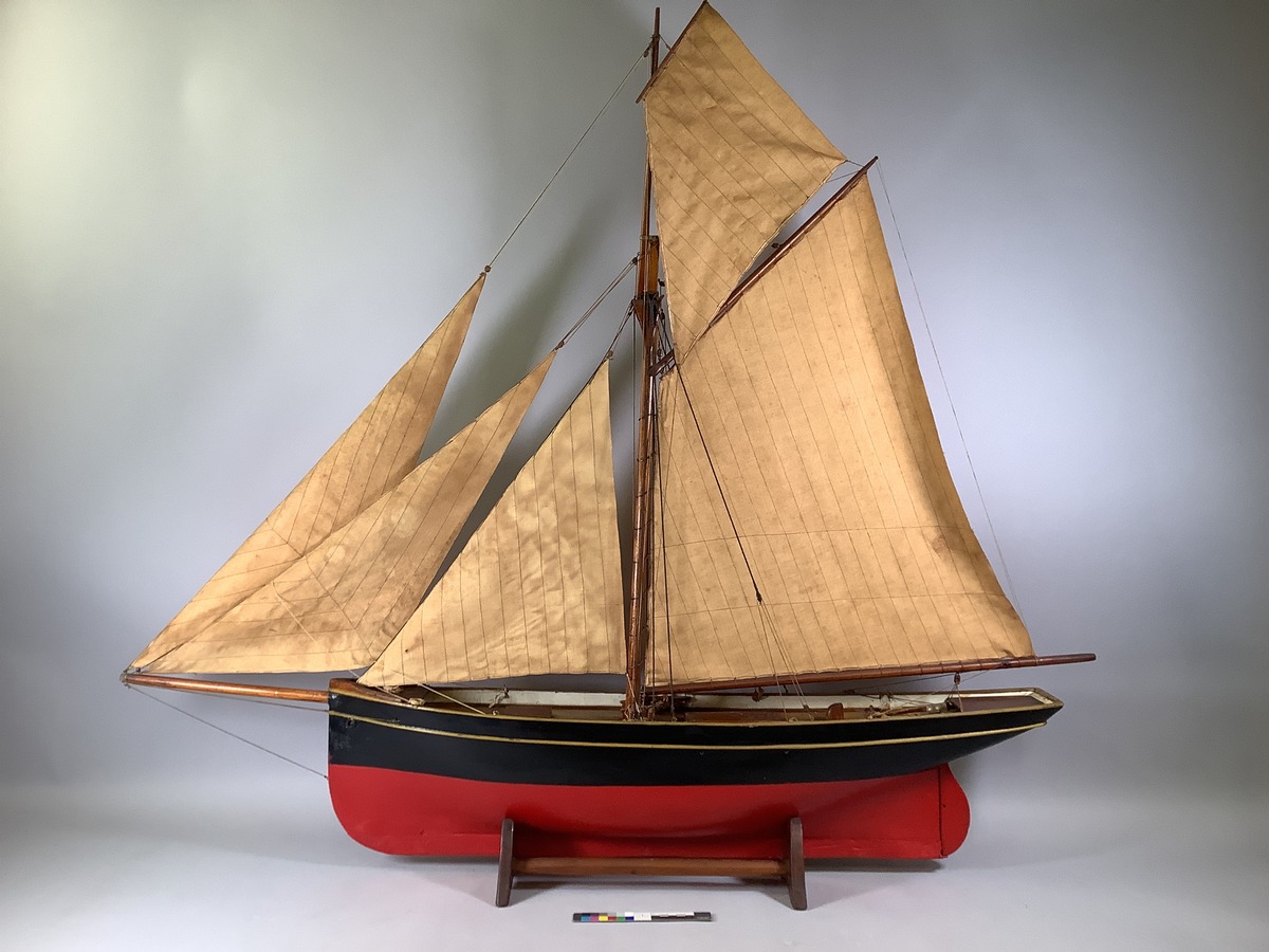 Fullmodell av jaktriggad engelsk kutter, skrovet svatmålat med gul rand, röd botten, i övrigt lackad. Seglen är av brun bomullsduk, nysydda. Med längsgående blyköl. Kondition: Riggen är skadad, förstagen är av, bogsprötet brutet, förfseglen nedtagna. Även en viss del av däcksutrustningen är skadad och bottenfärgen. Främst på blykölen har släppt. Proviniens: Har ägts och enl. uppgift även tillverkats av Otto Hansson, Göteborg, som sedermera gav den till givaren och dennes broder.