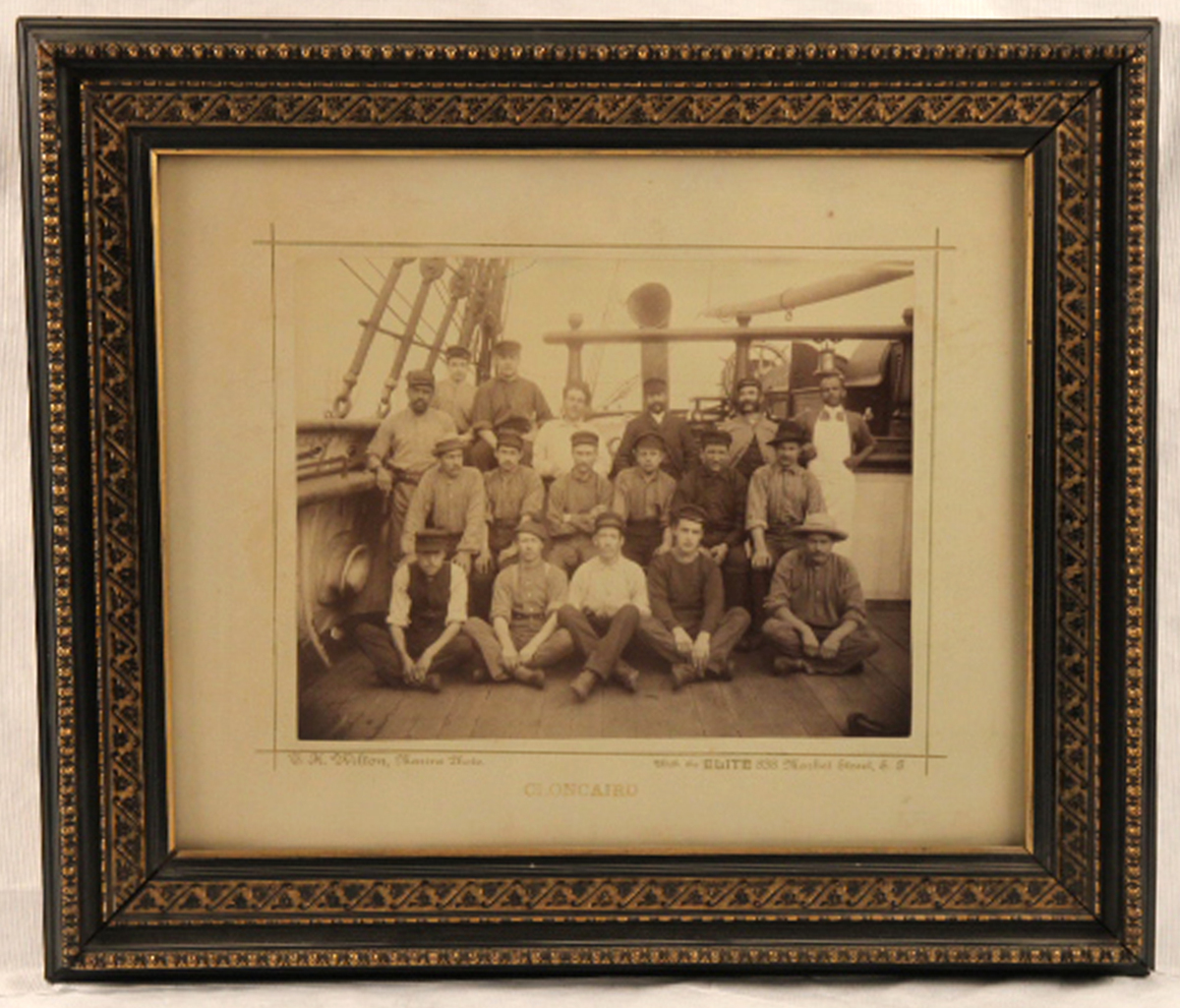 Inramat fotografi föreställande besättning på CLONCAIRD. Fartyget hade stålskrov och gick under 1890-talet på traden USA-Australien-Nya Zeeland.
