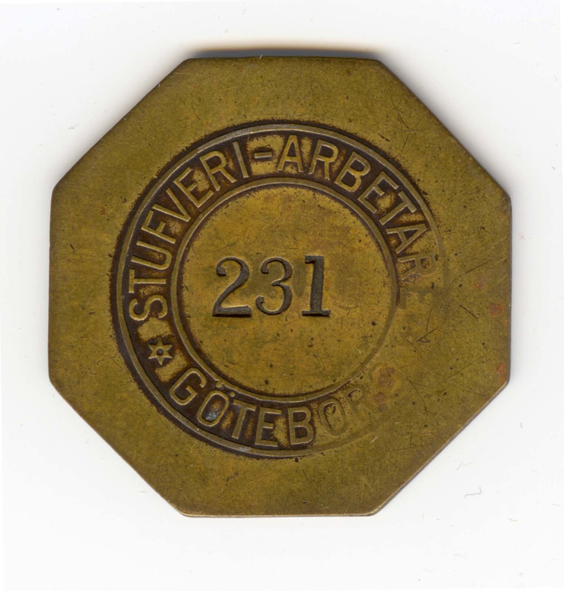 Sexkantig stuveribricka, märkt med ”Stuveriarbetare. Göteborg. 231”.