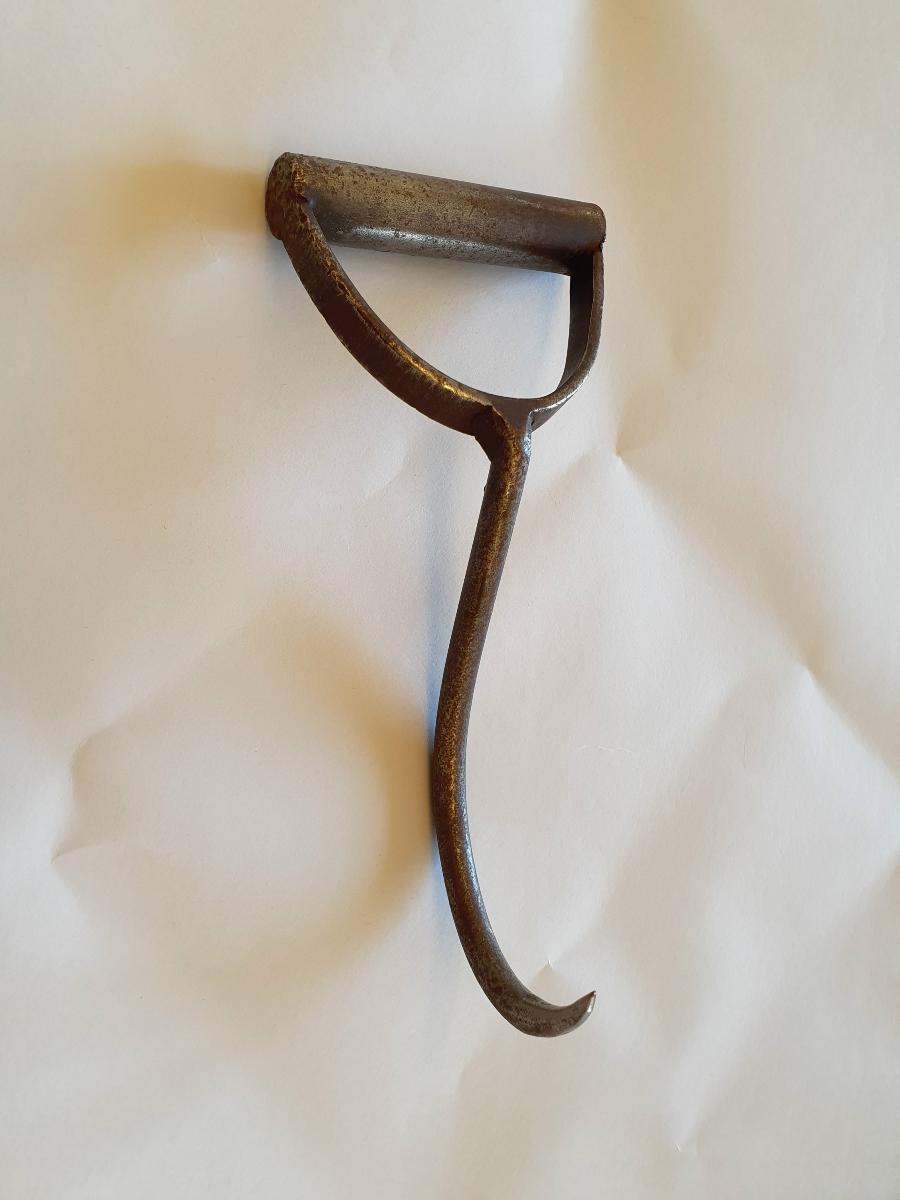 Den här typen av grips, där en större krok är placerad på mitten ett handtag är en av de vanligast förkommande. Den här gripsen är dock unik i samlingarna utifrån att även handtaget är av järn. Från Göteborgs Hamnarbetarkontor.