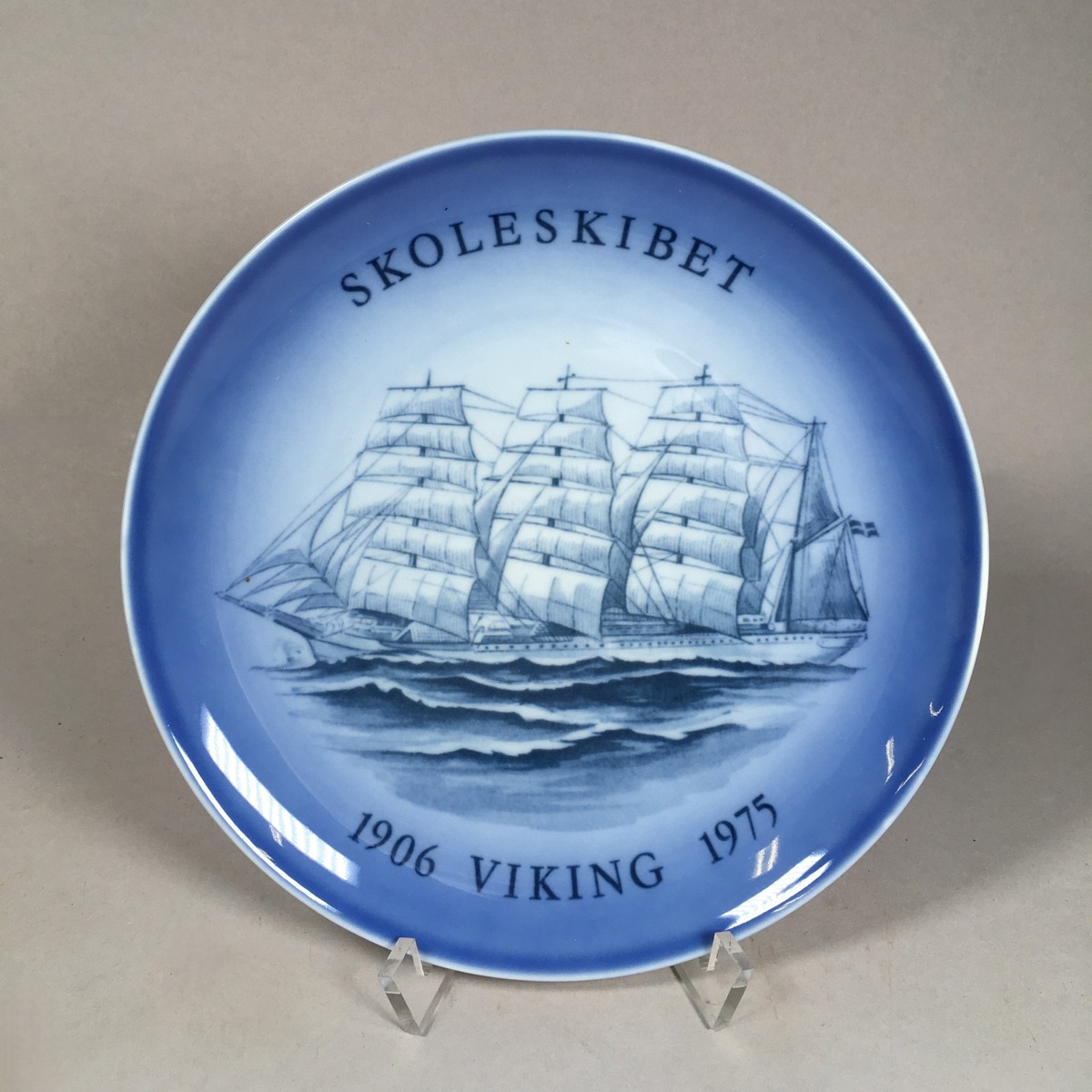 'Skoleskibet VIKING 1906-1975'. Text på baksidan: 'Danish Marine plate no. 5 - 1975 The training ship VIKING. Four-masted bark. Built 1906 at the Burmeister & Wain shipyard, Copenhagen, for the institution Den Danske Handelsflådes Skoleskib For Befalingsmænd. Sold in 1915 to the shipping company D F D S, Copenhagen. Sold in 1929 to the shipping company of Gustav Erikson, Mariehamm, Finland. From 1949 stationary training ship in Gothenburg, Sweden. Length: 288 feet - Breadth: 45 feet - 3500 DWT - 2665 net tonnage. Crew: 110 men.'
