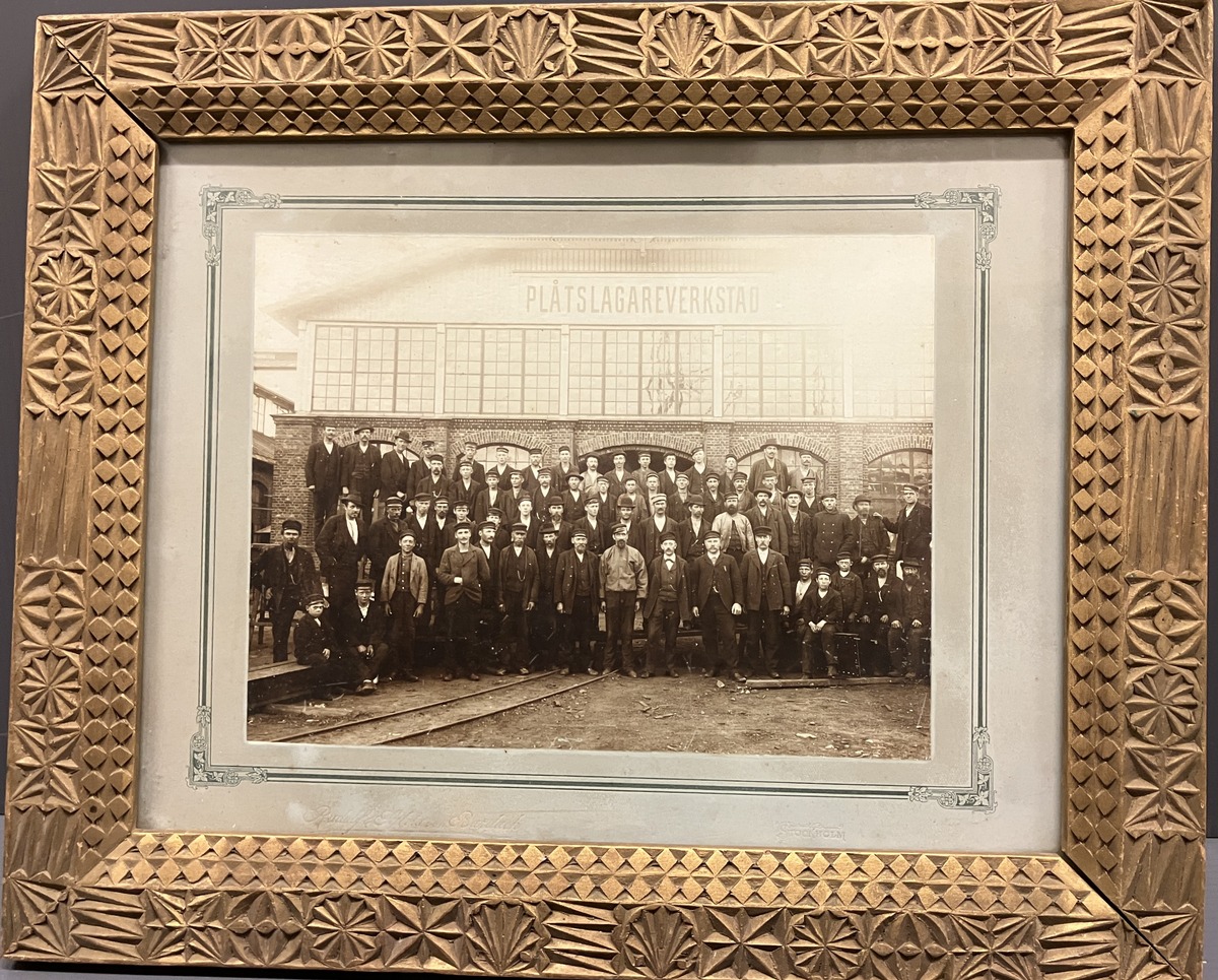 troligen plåtslageriverkstaden på Götaverken och dess arbetare. Inramad i förgylld rikt utsirad ram.