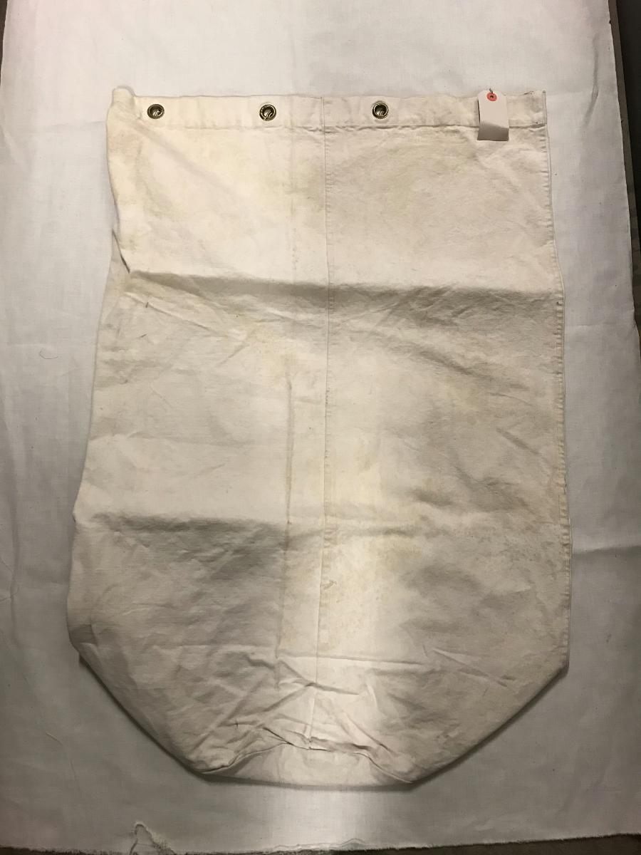 Maskinsydd säck av vit duk, med öljetter längs överkanten, saknas märkning. Kond. Ny.