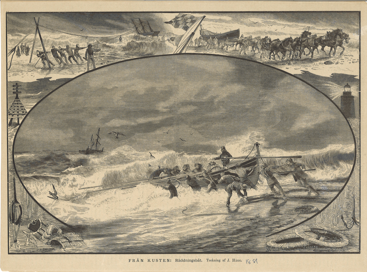 Tidningsurklipp föreställande trägravyr med räddningsbåt