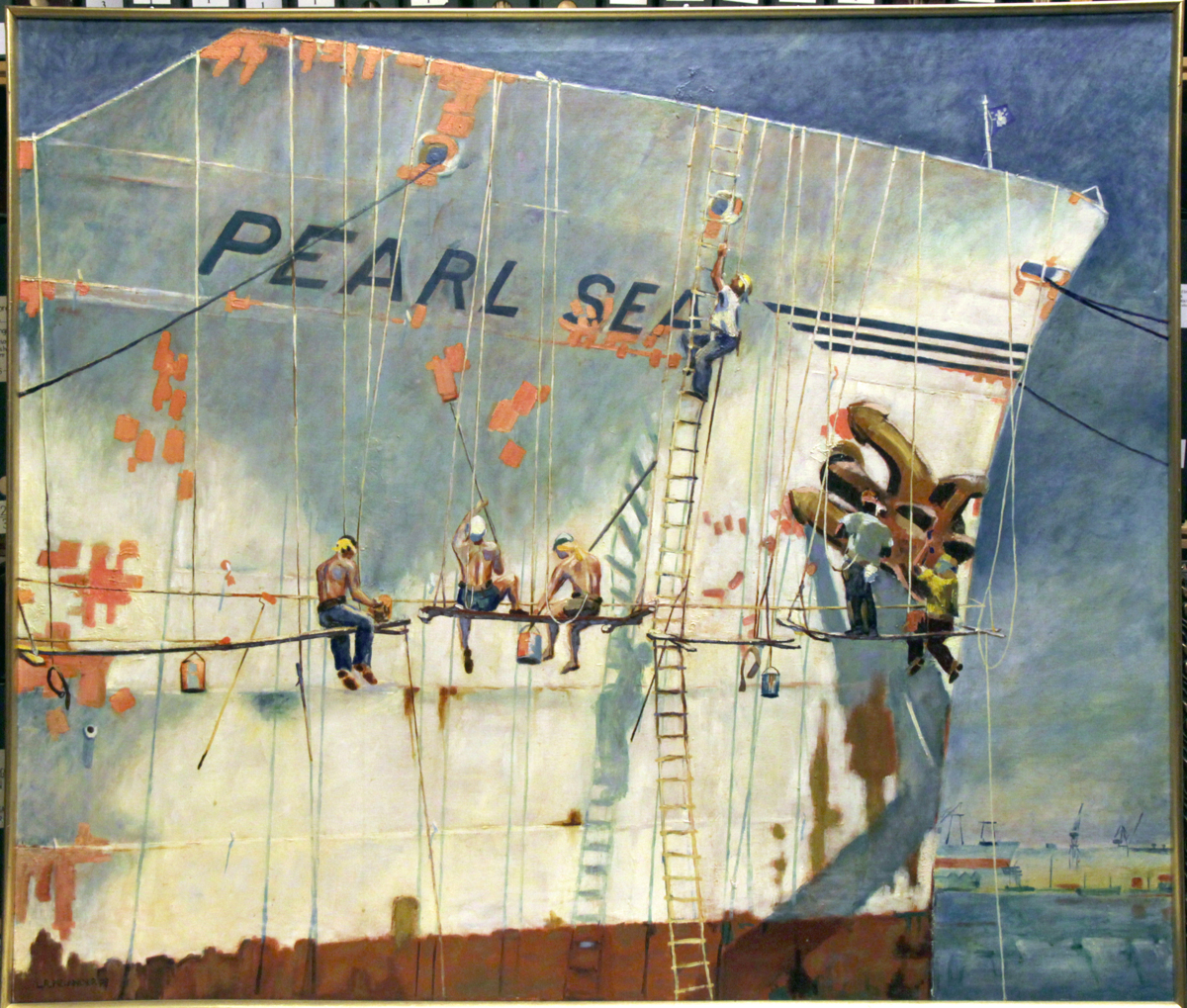 Inramad oljemålning föreställande målning av fartygssida. Konstnären berättar, längst till vänster på tavlan, där det är en tom plats på ställningen och en säkerhetssele hänger och dinglar, satt jag. Men jag tog 5 minuter och gick ner på kajen i Barranquilla i Colombia och tecknade en skiss.