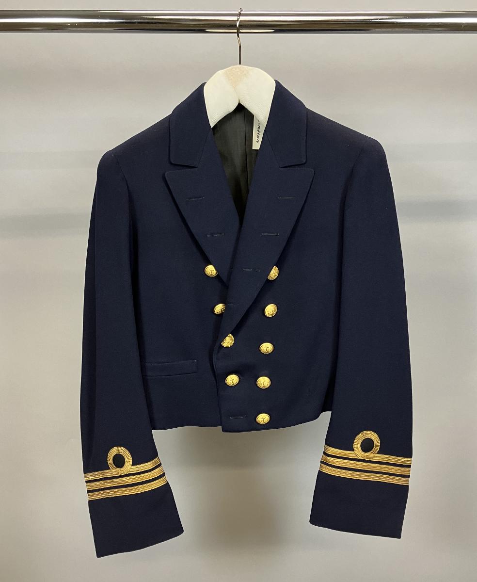 En paraduniformsjacka, m/1878, i mörkblå med dubbla rader knappar. Försedd med galoner för kapten. Har tillhört kapten Atle Magnusson, Jakobsdalsgatan 17 II, Gbg. Var kapten under 2:a Världskriget. Därefter i Broströms.